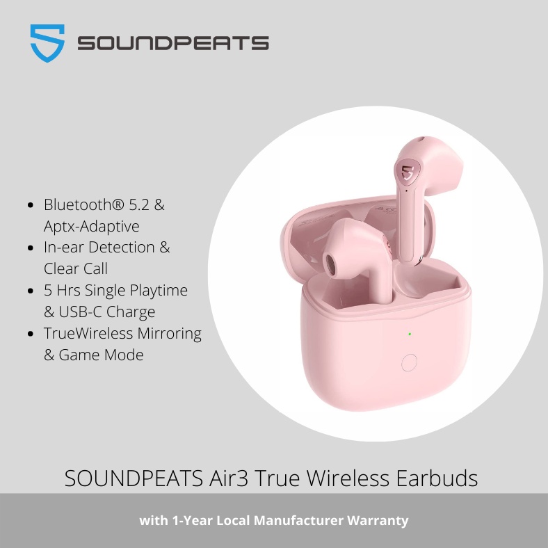 SoundPEATS Air3 True Wireless Earbuds - Pink Bluetooth 5.2 & Aptx-Adaptive In-ear Detection & Clear