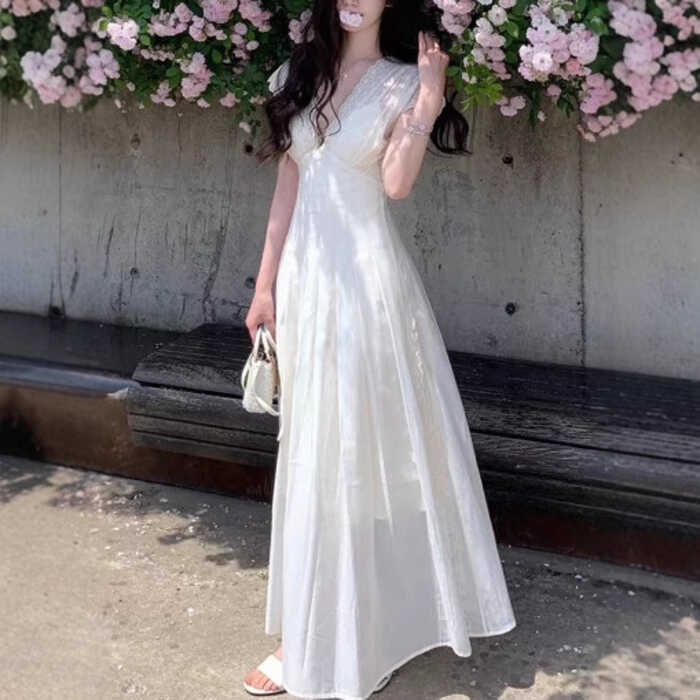 Pure White Beauty Goddess Dress, 60-count Lyocell Tencel, Heavy Lace Patchwork Waist-Cinching Dress