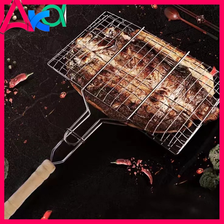Stainless steel non stick fish grill mesh wire net with wooden handle BBQ tools grill clip,Aka