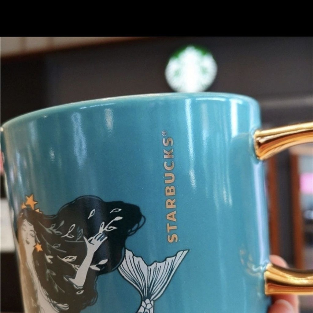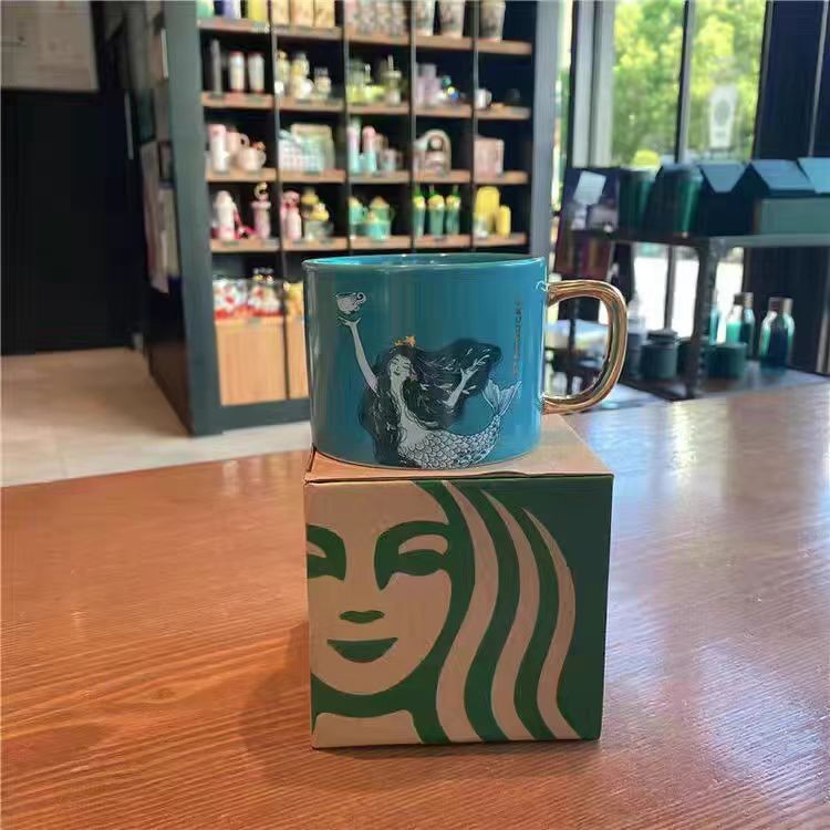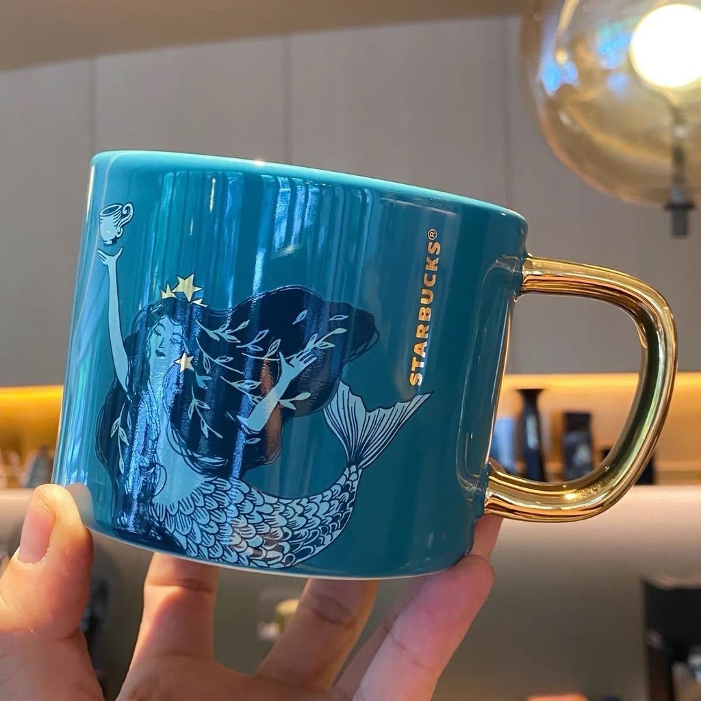 Starbucks Cup Mermaid Charm Mug Dark Green Mermaid Ceramic Cup Desktop Water Cup Gold Handle Coffee Cup 355ml