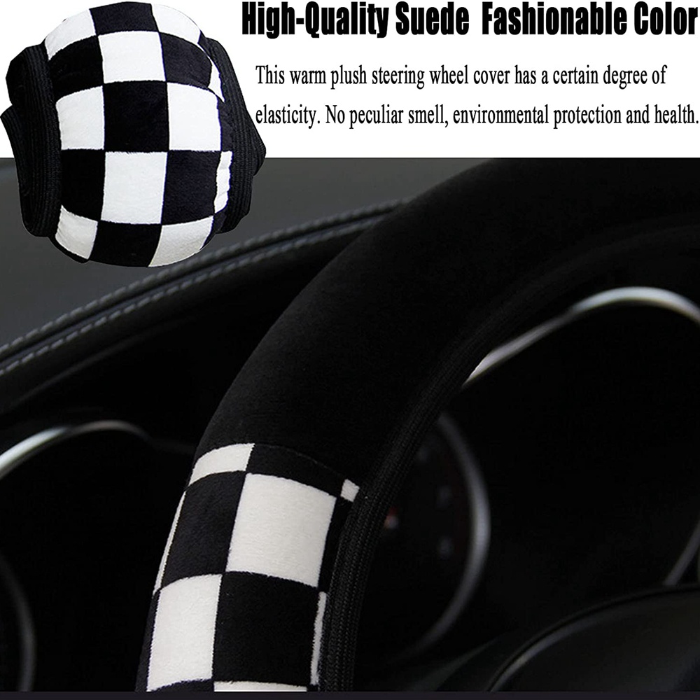 Steering Wheel Cover for Men Women, Black and White Checkered Steering Wheel Cover Grid Car Steering Wheel Cover, Warm Plush Universal Car Accessory Fit Cars,15 Inch