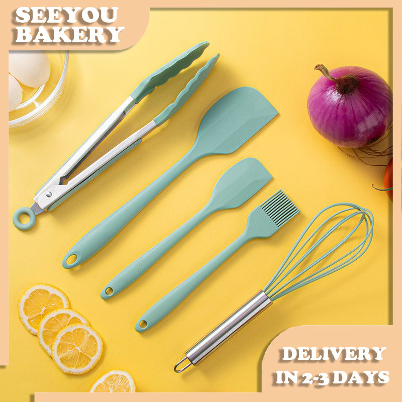 5pcs Silicone Kitchen Utensils Set Heat Resistant Baking Tool Cookware Tongs Whisk Spatula Brush