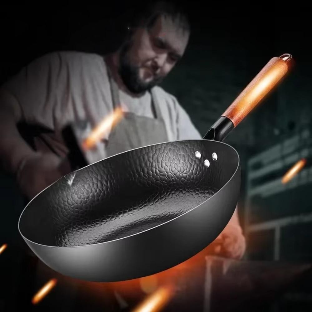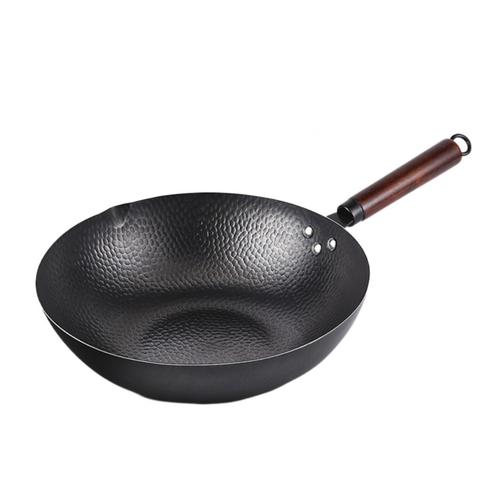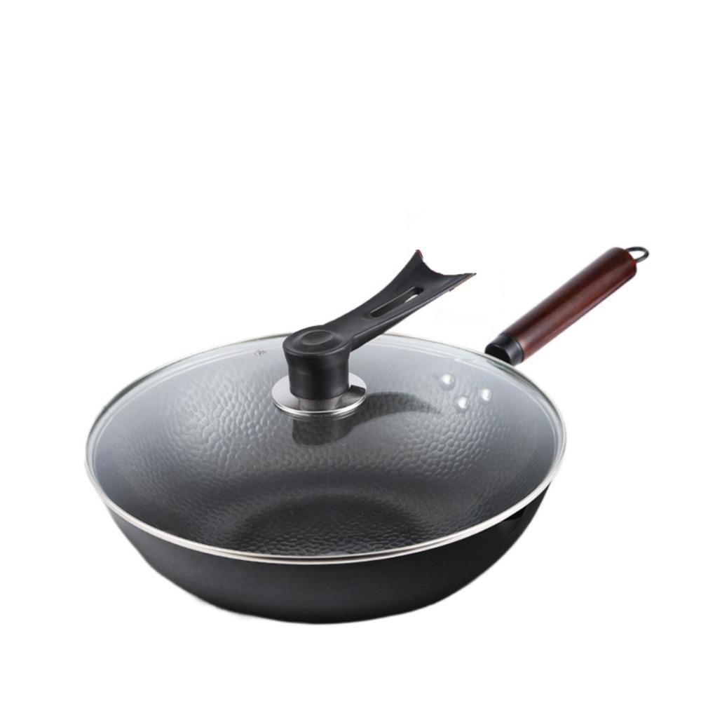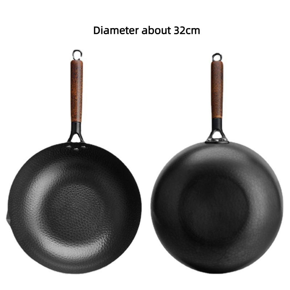 COZEE Cast Iron Pan, Hand-forged 32cm Chinese Wok, Durable with Lid General Use Non-stick Iron Wok for Gas Induction Cooker