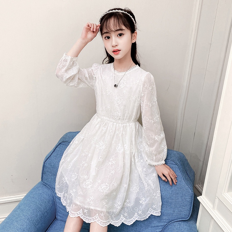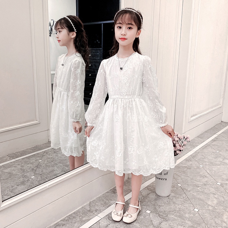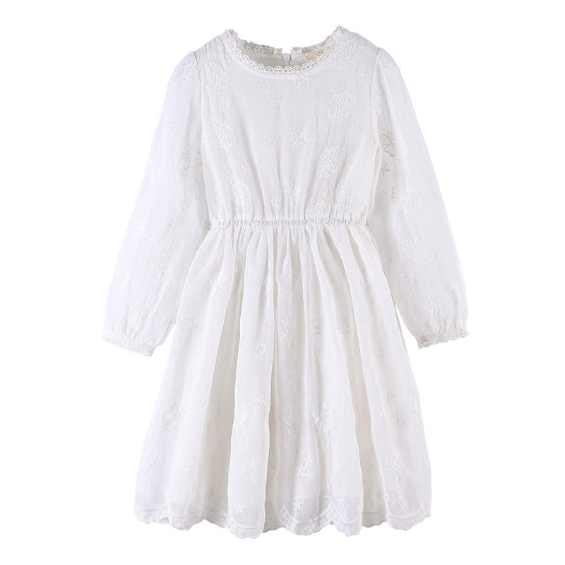 Summer Lace Long Sleeve Dress Girls 3-12y Embroidery White Flare Sleeve Dress Hollowout Embroidery White Princess Dresses