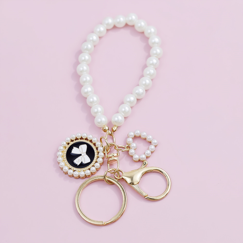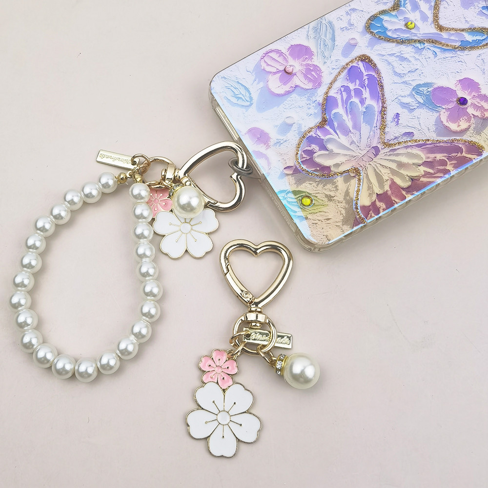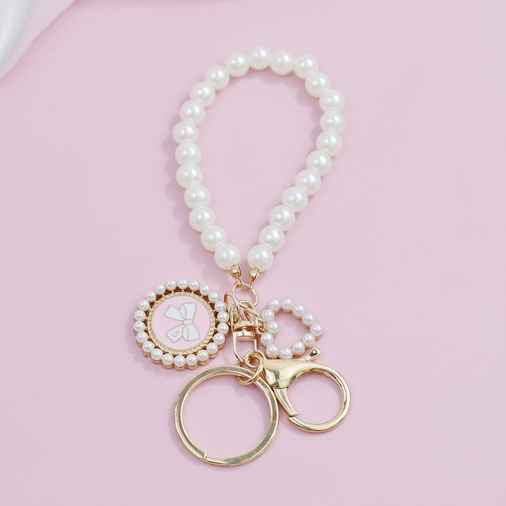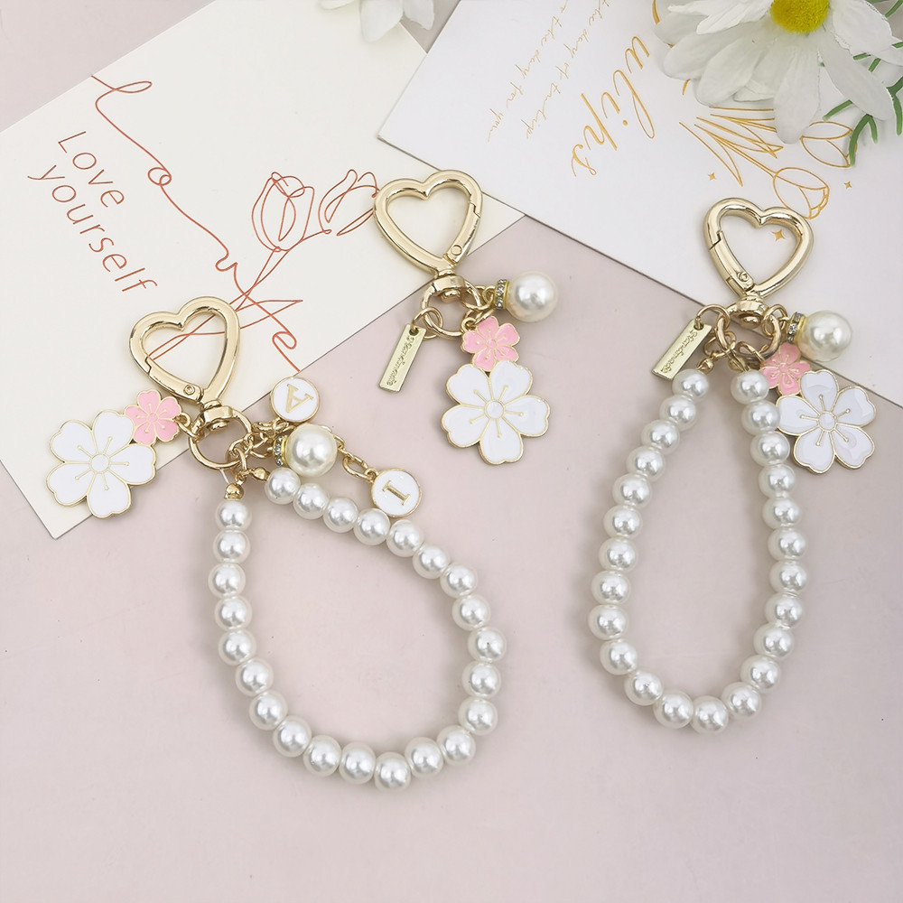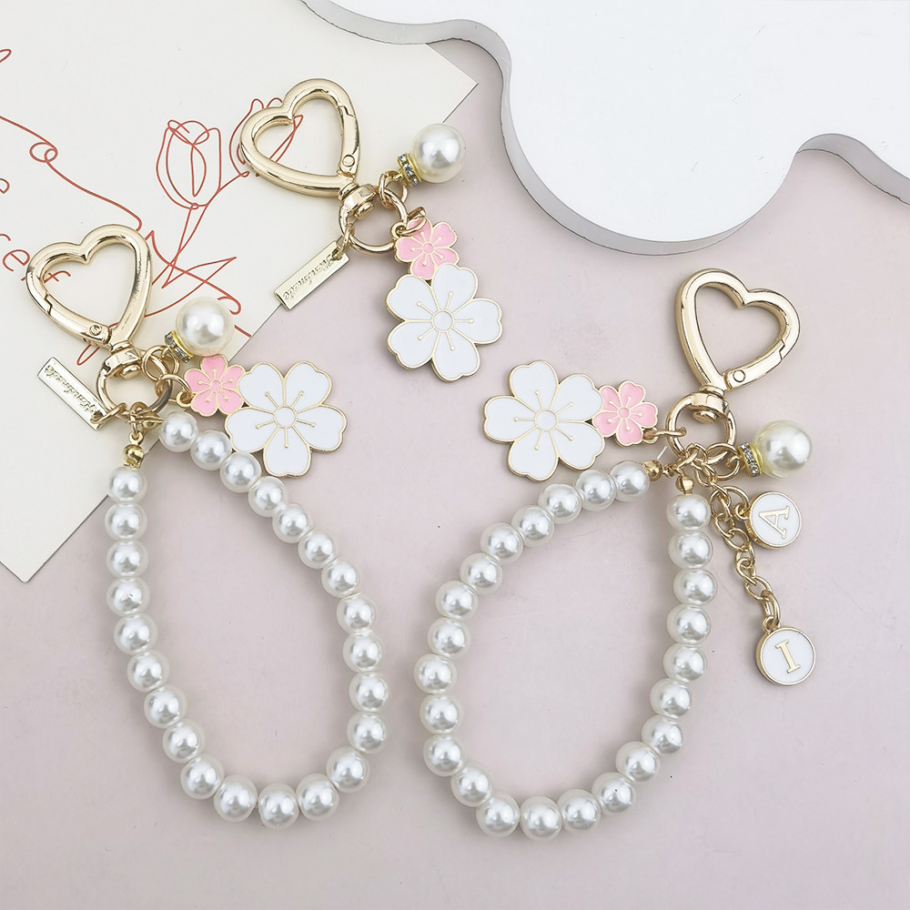 Sweet Pink Sakura Flower Key Ring Fashion Pearl Keychains With Metal Circular Letter Tag Women Girl Callphone Car Handbag Ornaments