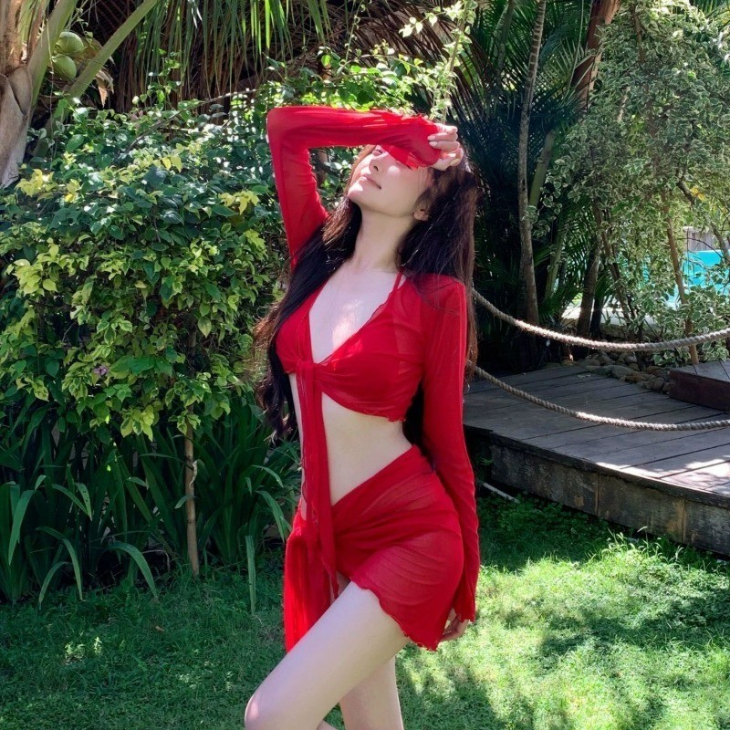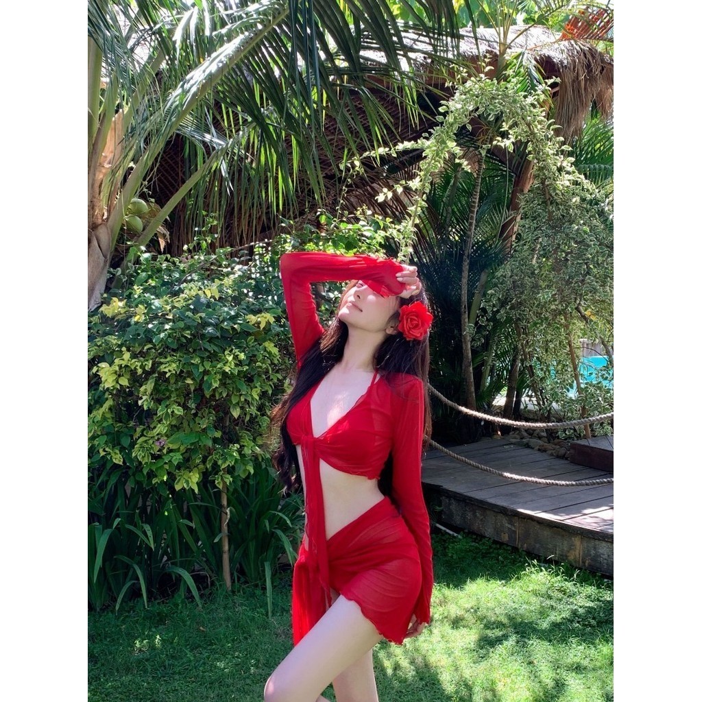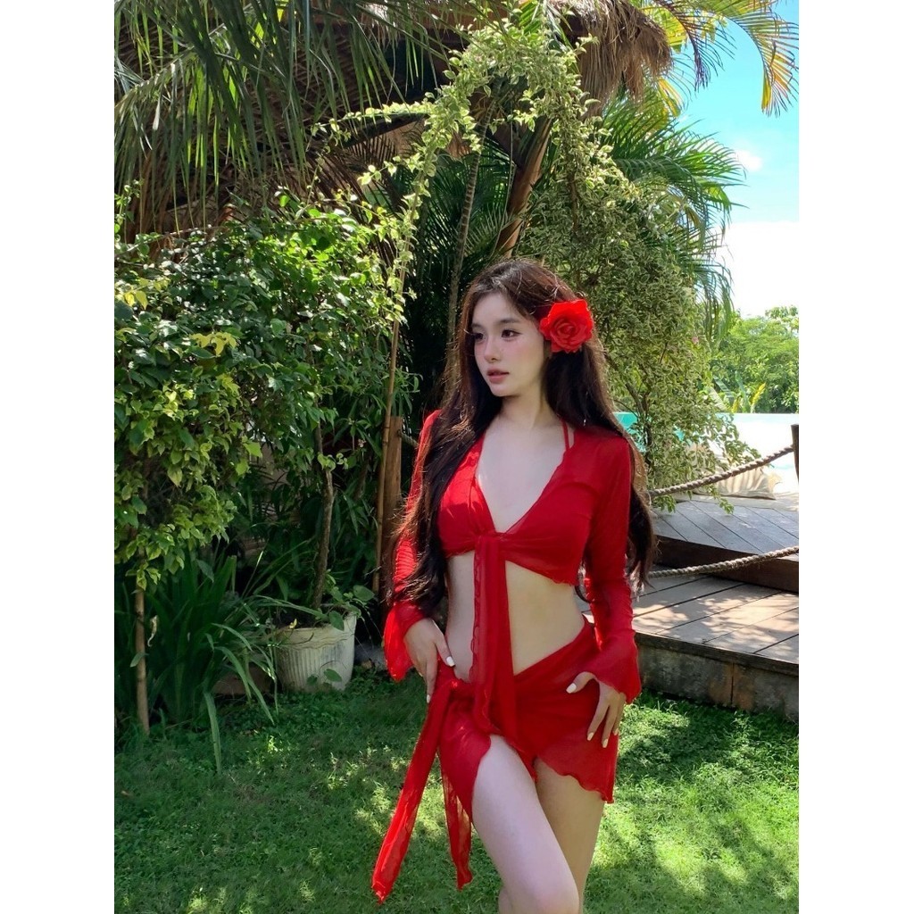Swimsuit Feminine Big Red Bikini Four-piece Swimsuit Travel Hot Spring Korean Version INS Beach Bikini Set