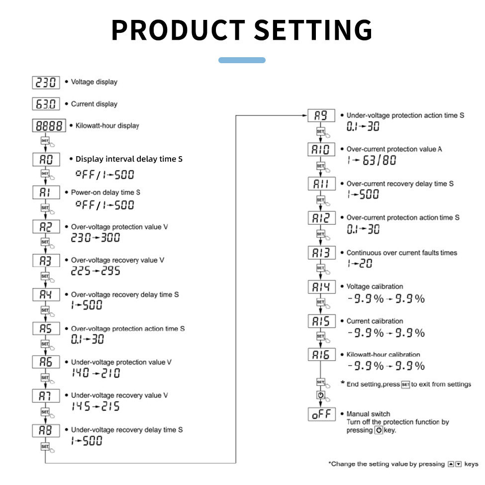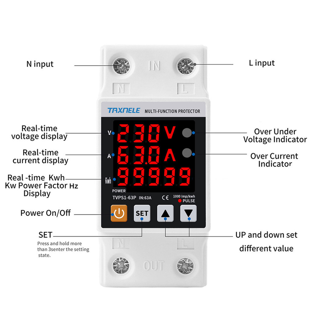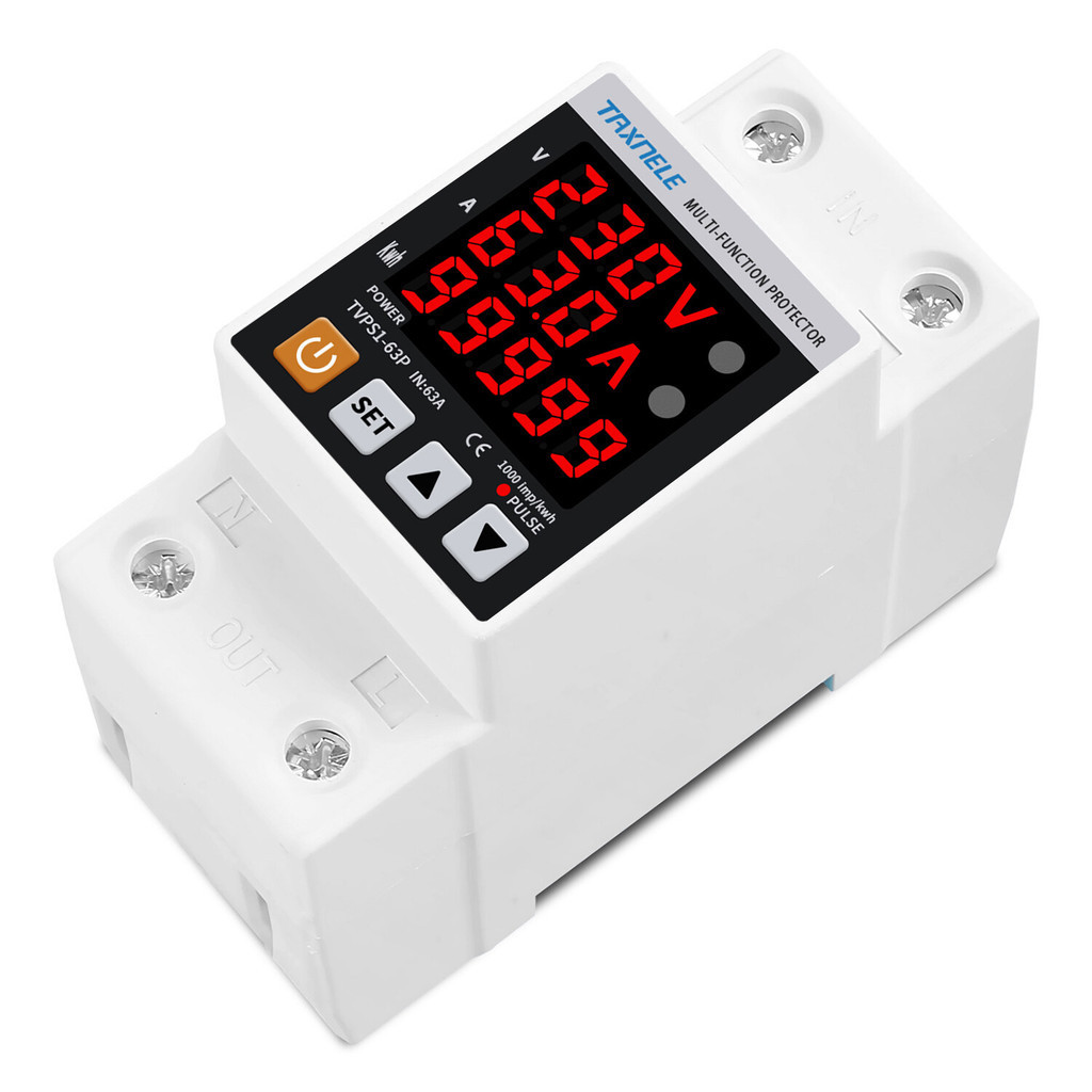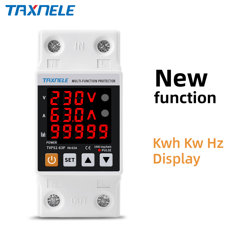 TAXNELE 220V 63A Adjust Over Under Voltage Protector Over Current Limit Wattmeter KWH Energy Meter Power Comsumption Voltage Protection