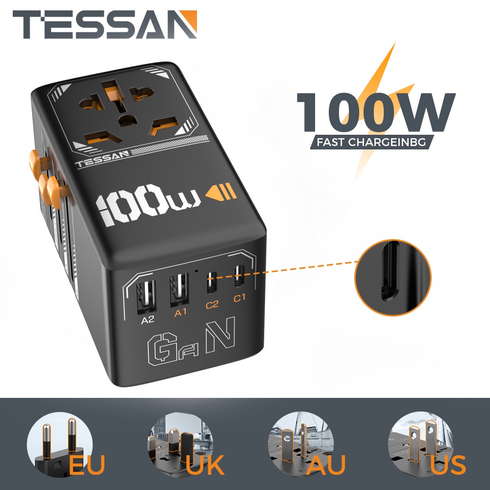 TESSAN 100W GaN Universal Travel Adapter with USB &Type C Fast Charging International Plug Adapter EU/UK/USA/AUS Plug for Travel