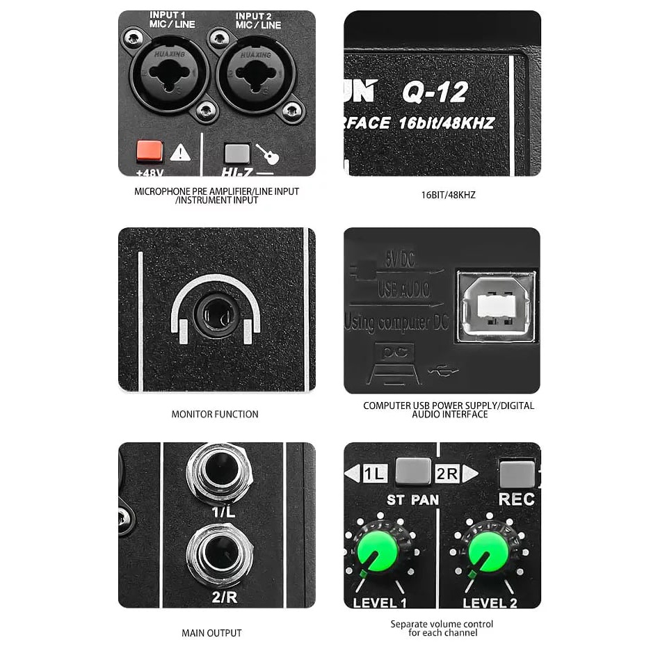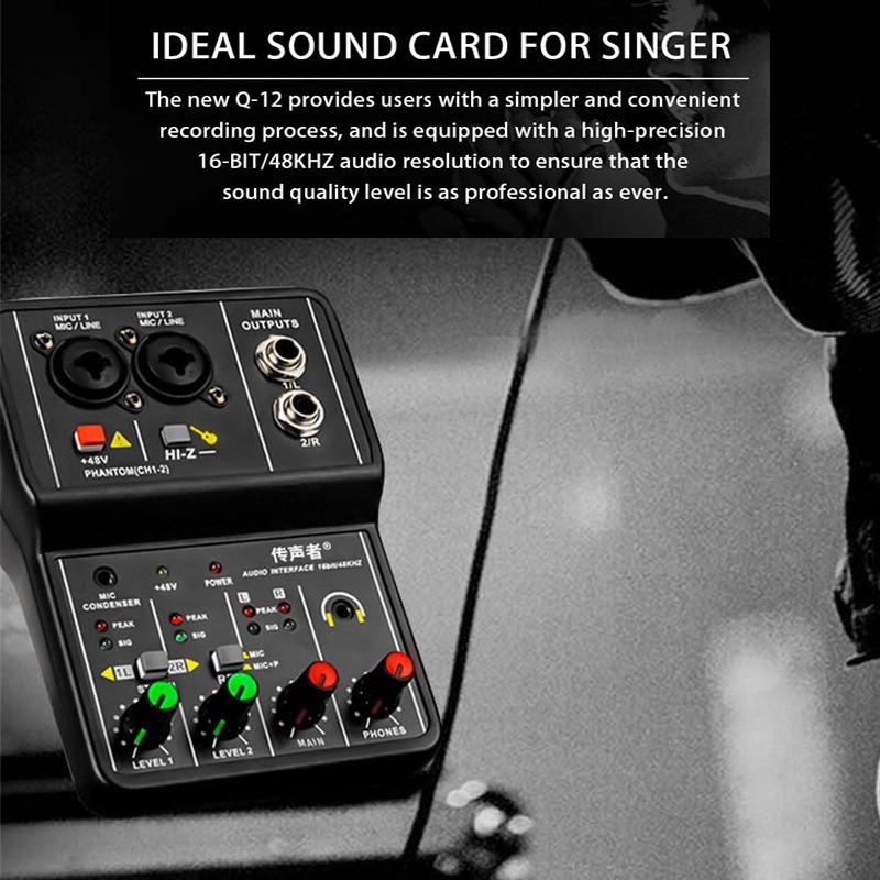 TEYUN Q-12 V2.0 Audio Interface 16bit/48khz Sound Card 48V Phantom Power Recording Livestreaming
