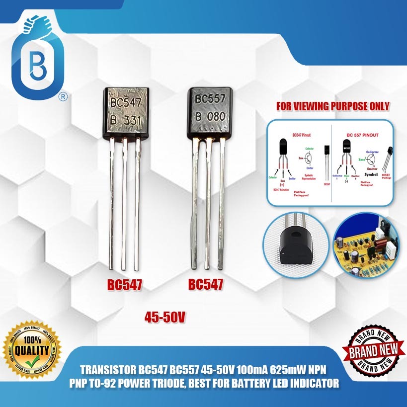TRANSISTOR BC547 BC557 45-50V 100mA 625mW NPN PNP TO-92 POWER TRIODE, BEST FOR BATTERY LED INDICATOR