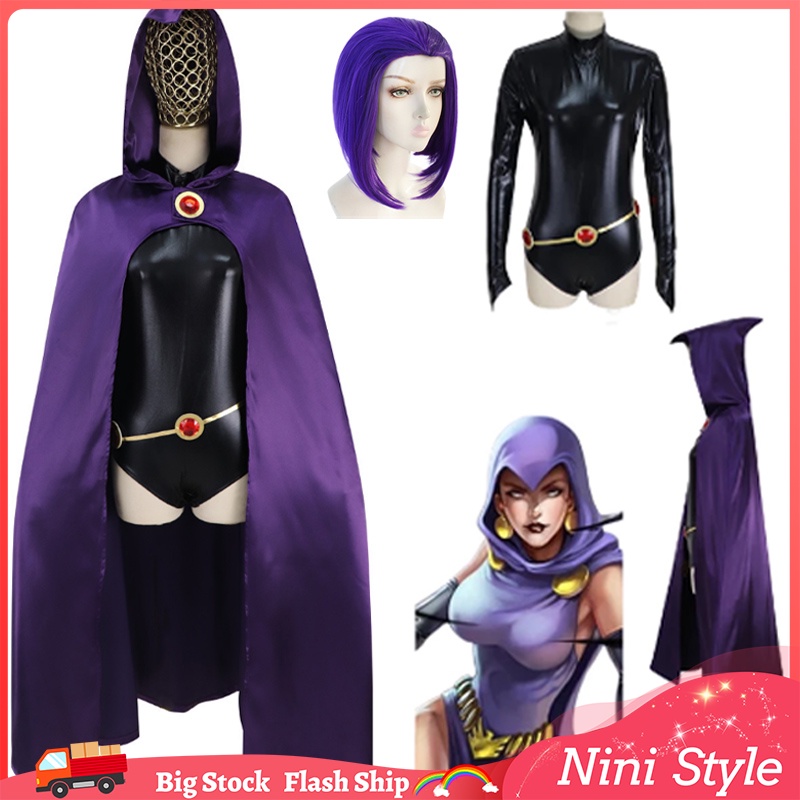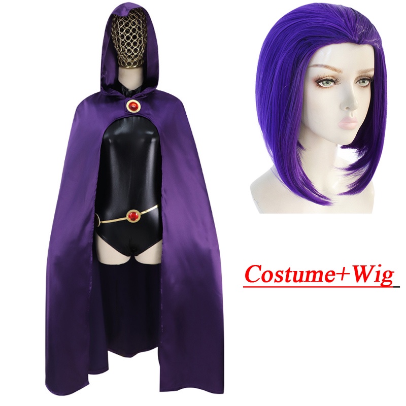 Teen Titans Raven Costume for Adult Women DC Superhero Deluxe Black Bodysuit Dark Purple Cloak Jewelry Suit S-3XL
