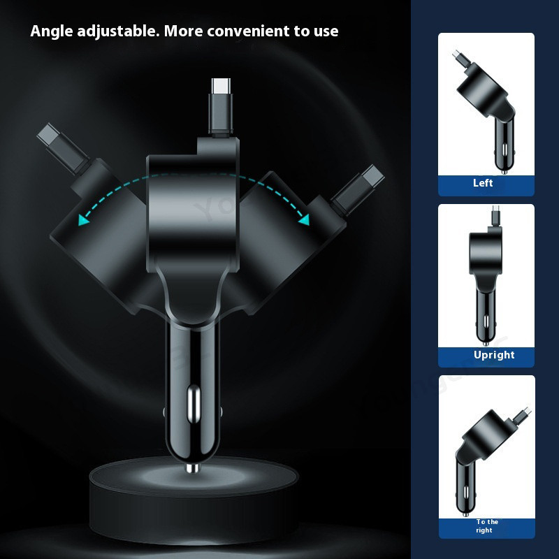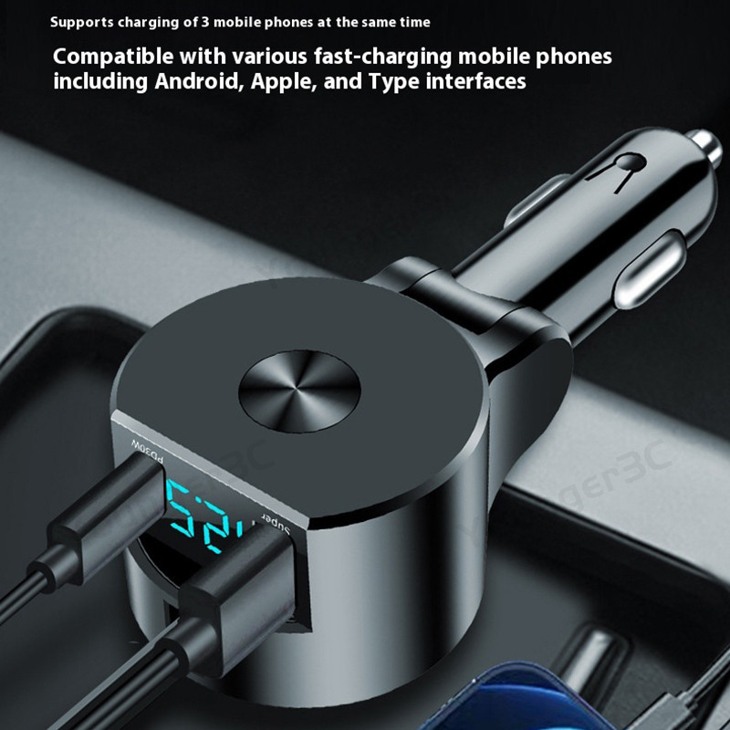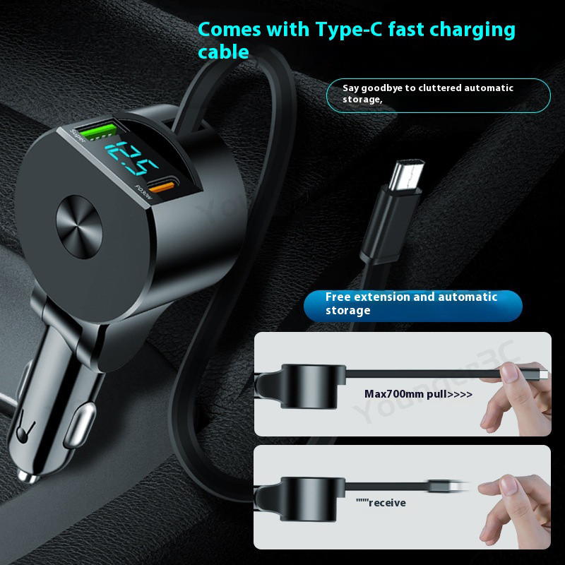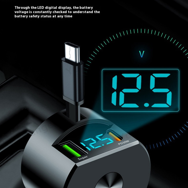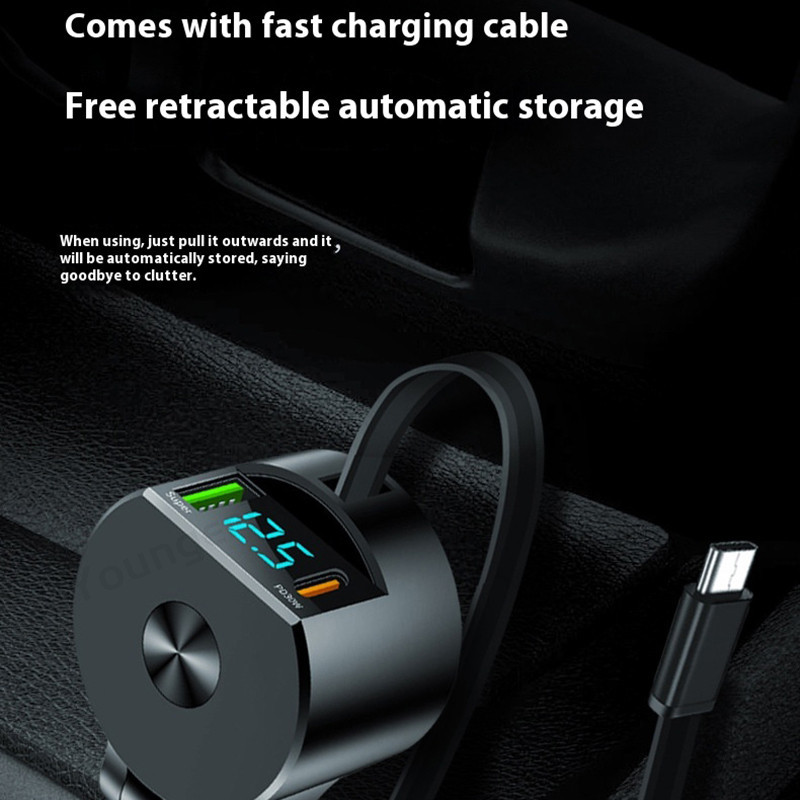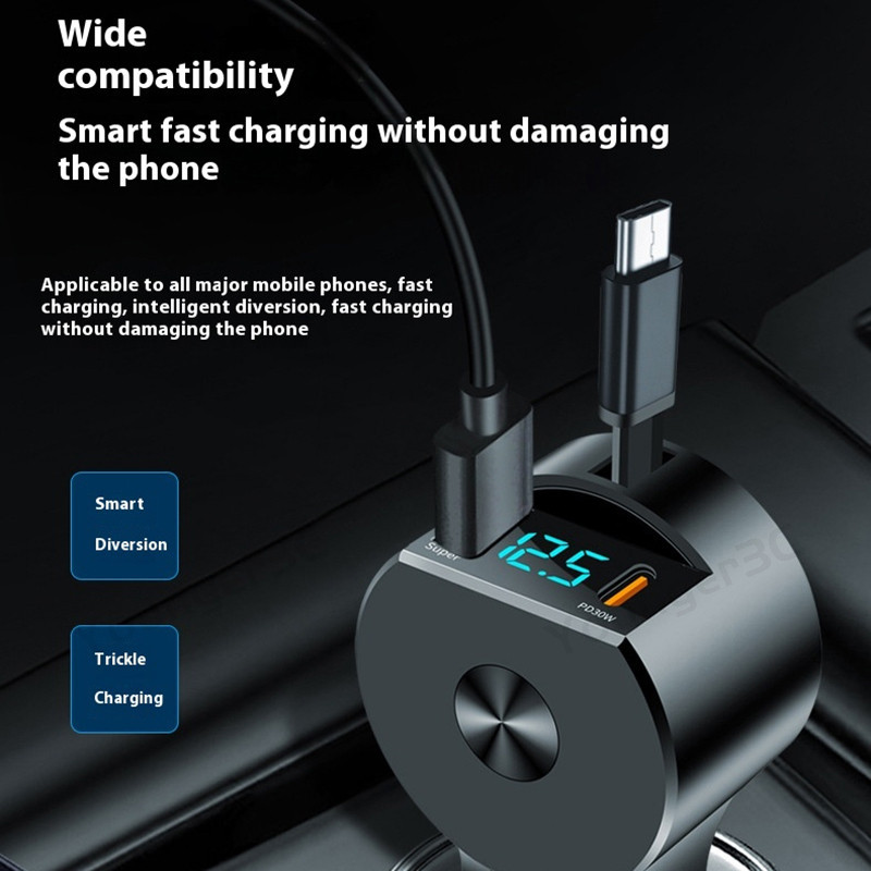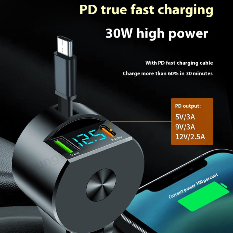Telescopic Digital Display Super Fast Charger USB+PD30W+Type C Cable Car Charger Car Lighter Adapter USB C Car Travel Charging Adoptor