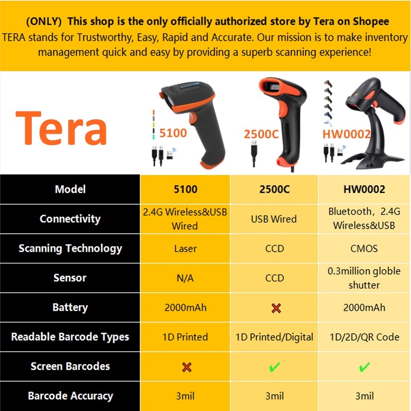 Tera 1D 2D QR Code Scanner with Stand Bluetooth Barcode Scanner Wireless Wired Scanners Barcode QR Scanner Laser CCD CMOS Scanner
