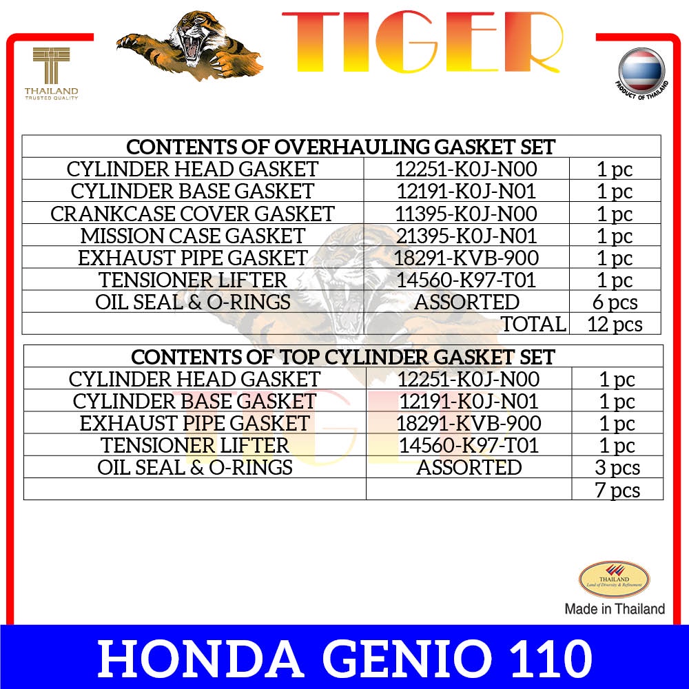 Tiger Genio 110 [Honda] Motorcycle Complete Engine Overhauling Gasket Set (100% Made in Thailand)