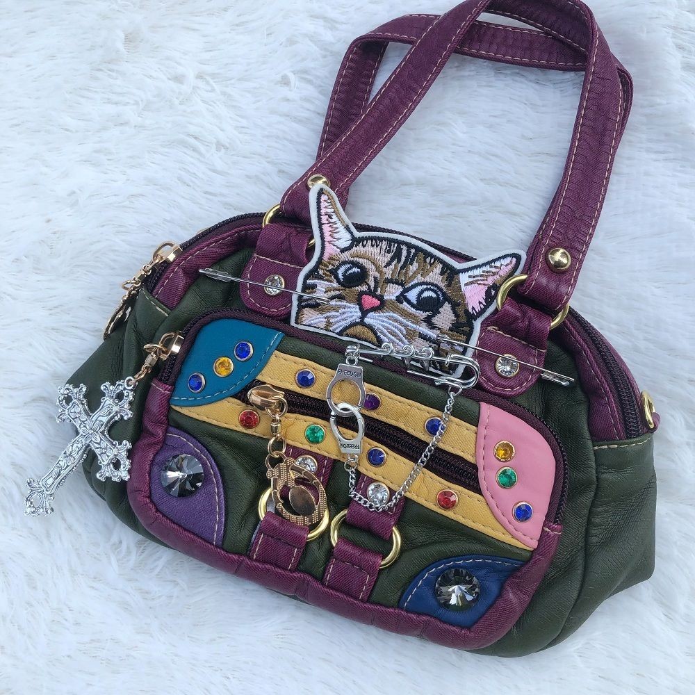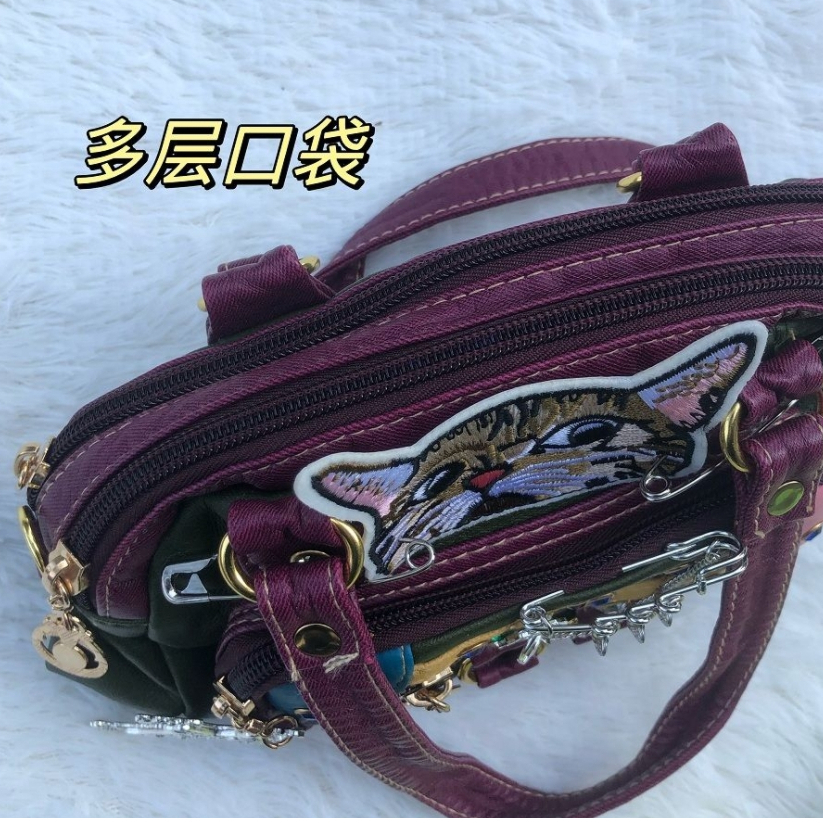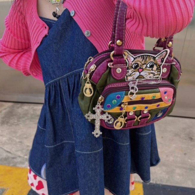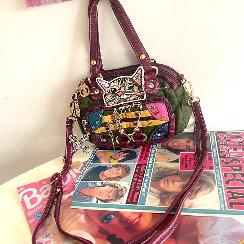 Tik Tok Same Style Original Retro Middle-aged Bag y2k Hot Girl Asian Cultural Gems Unique Kitten Soft Leather Portable Diagonal Bag