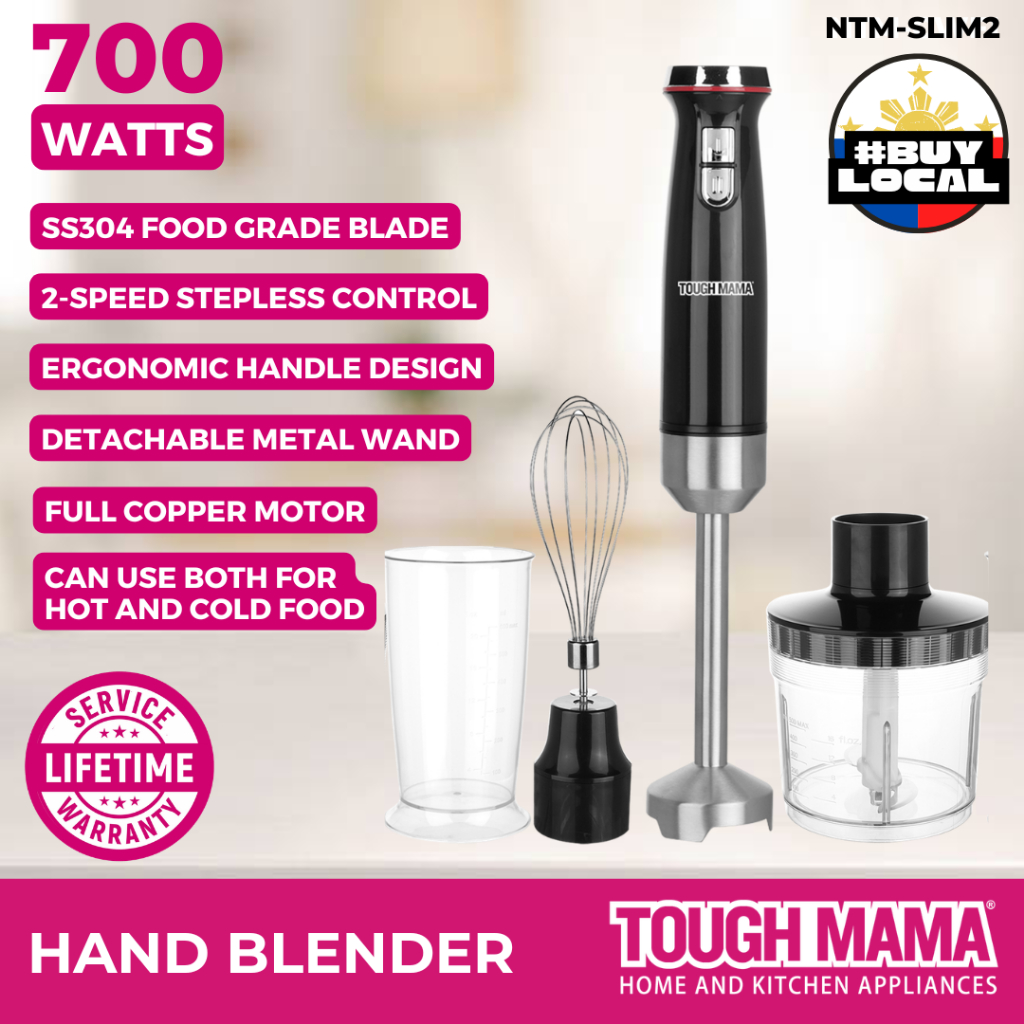 Tough Mama NTM-SLIM2 NEW Hand Blender Stainless Steel 700W with Whisk Chopper BPA-Free Cup
