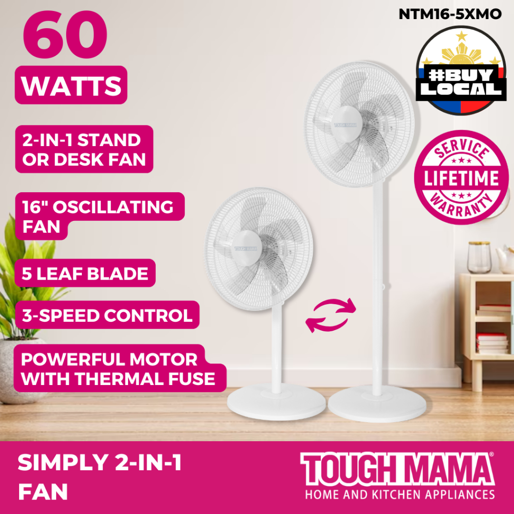 Tough Mama NTM16-5XMO WHITE Simply 2-in-1 Electric Stand and Desk Fan Minimalist Slim Powerful Gray