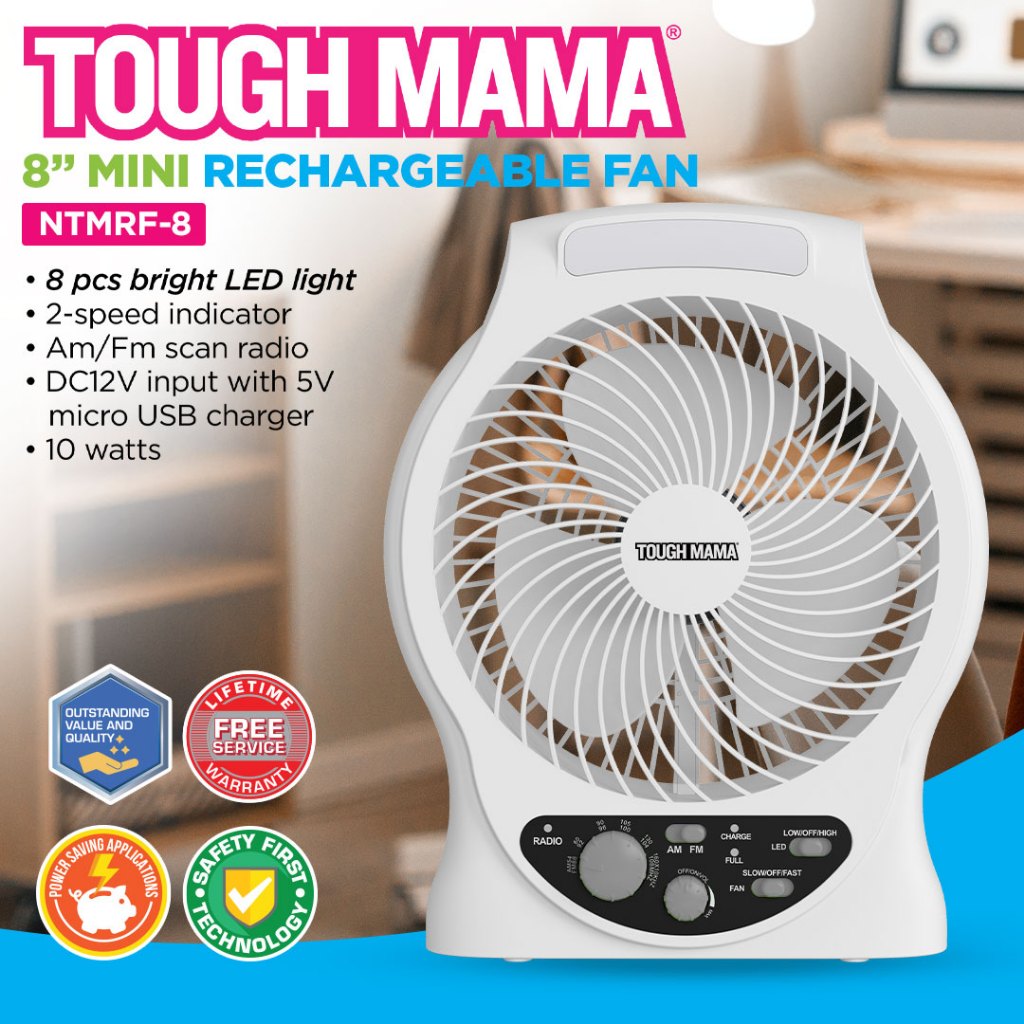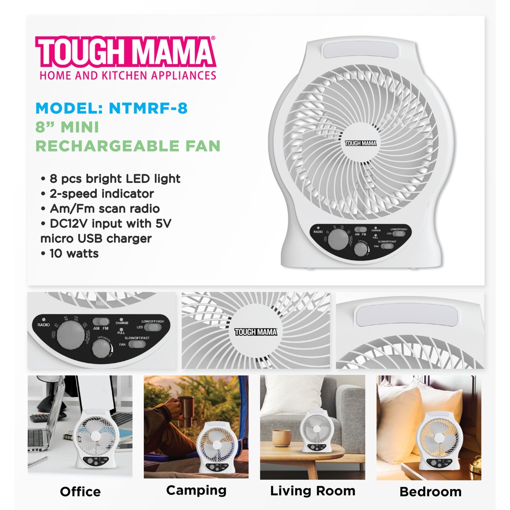 Tough Mama NTMRF-8 NEW Multifunctional Rechargeable with Radio LED light USB port Desk Fan