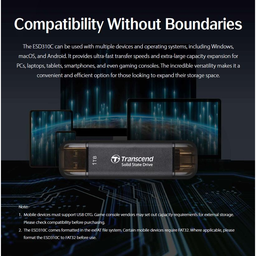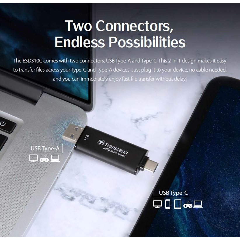 Transcend Portable SSD ESD310 256GB/512GB/1TB/2TB TypeC & TypeA Dual connector Up to 1050MB/s