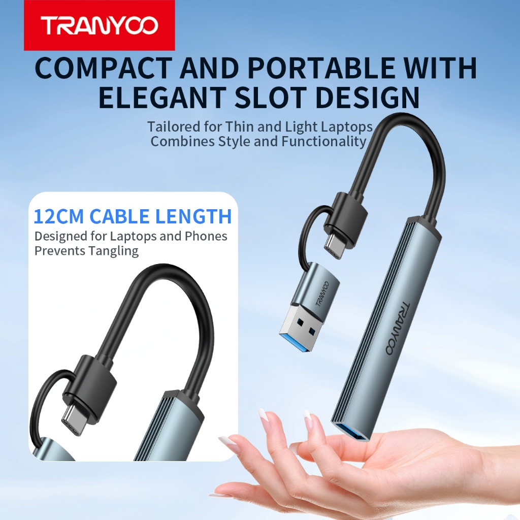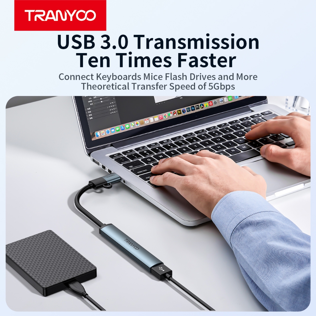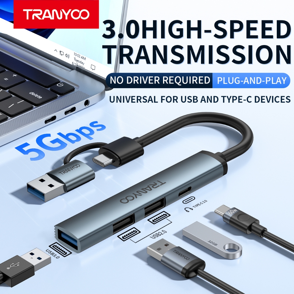 Tranyoo HB11-AC 4-in-1 Hub USB/Type-C to 3 USB3.0 and Type-C Port Hub for Mobile Phones and Tablets