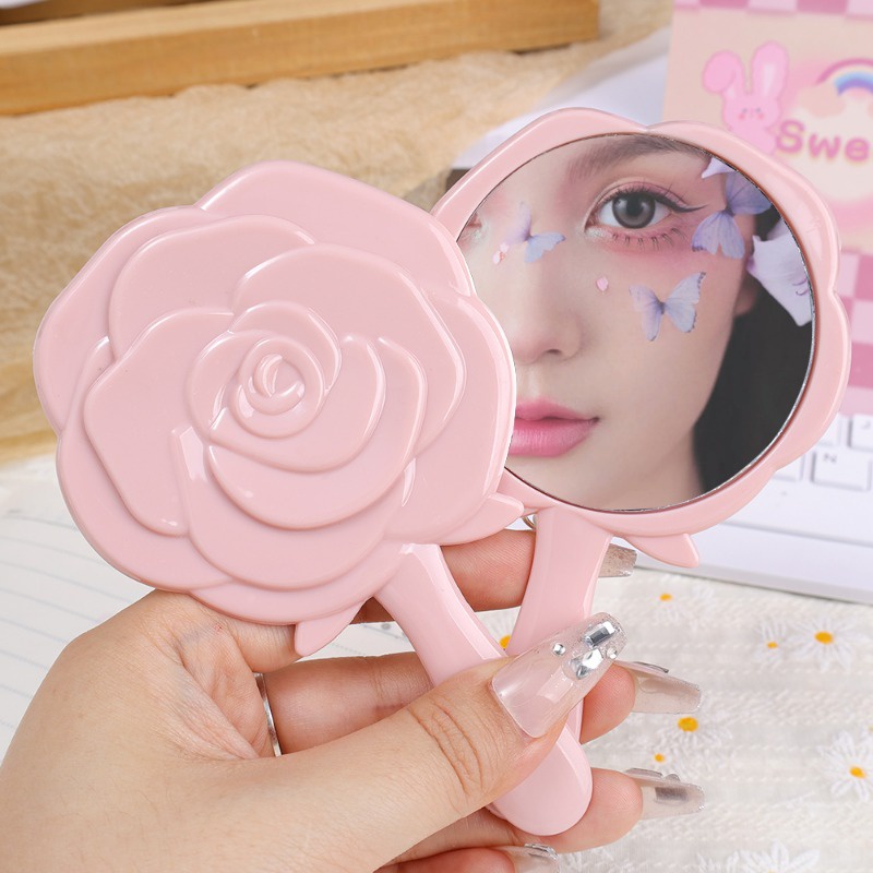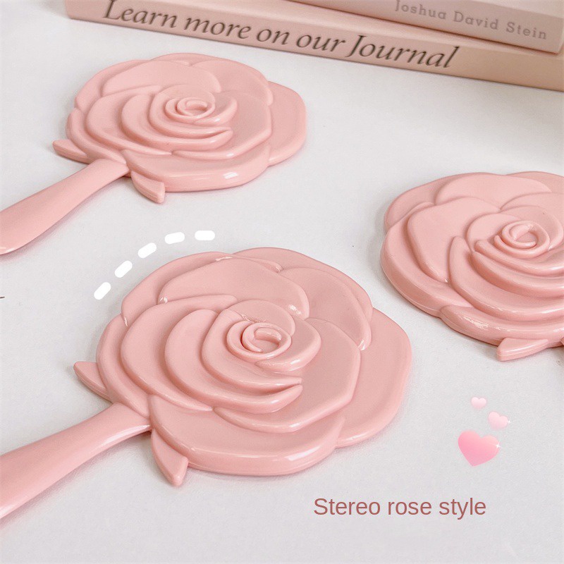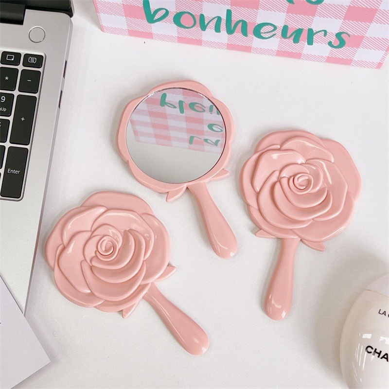 Travel Protable Hand-held Makeup Mirror / Vintage Rose Handheld Vanity Mirror / Pink Flower Shaped Princess Makeup Mirrors / Cute Mini Compact Round Hand Handle Pocket Mirror