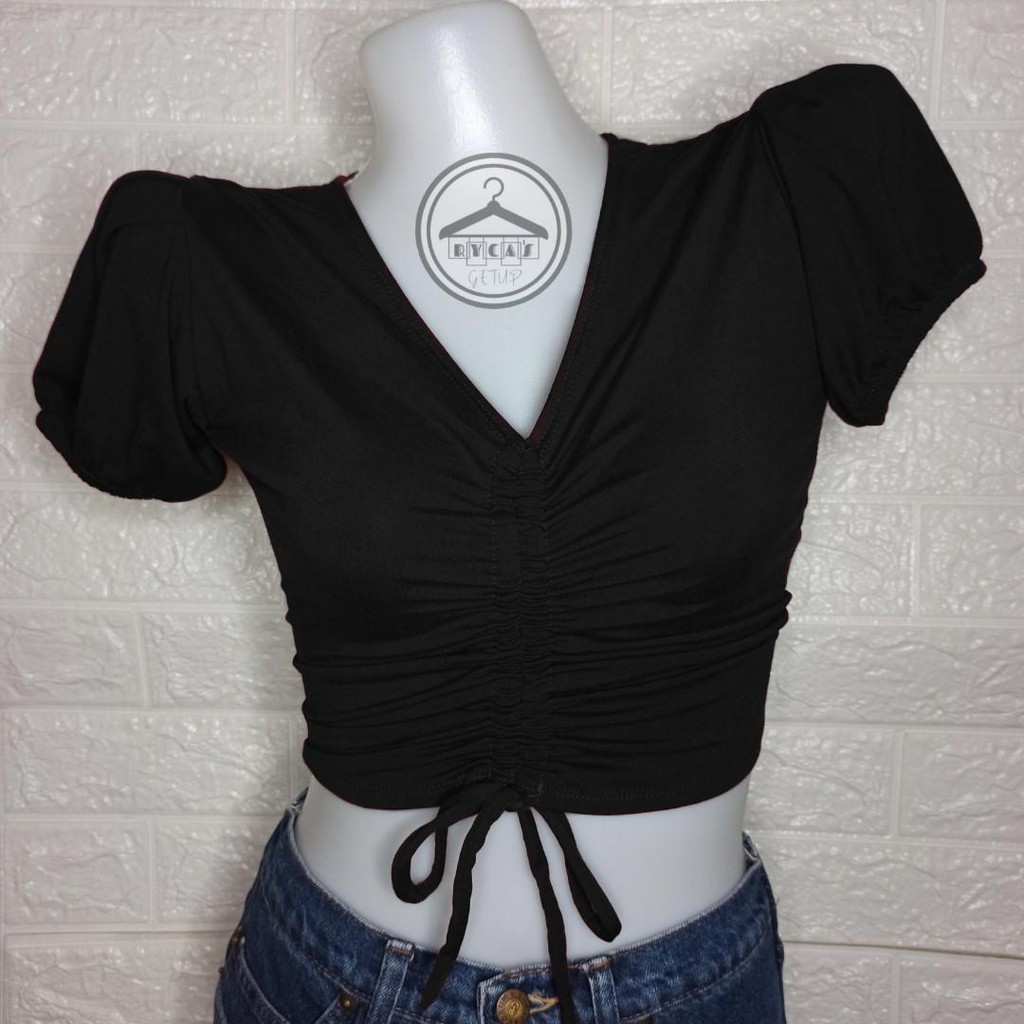 Trendy Sally Crop top / Semi Puff Sleeves Top / Middle Front String Ruched