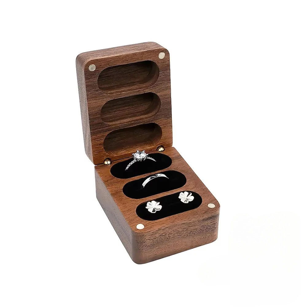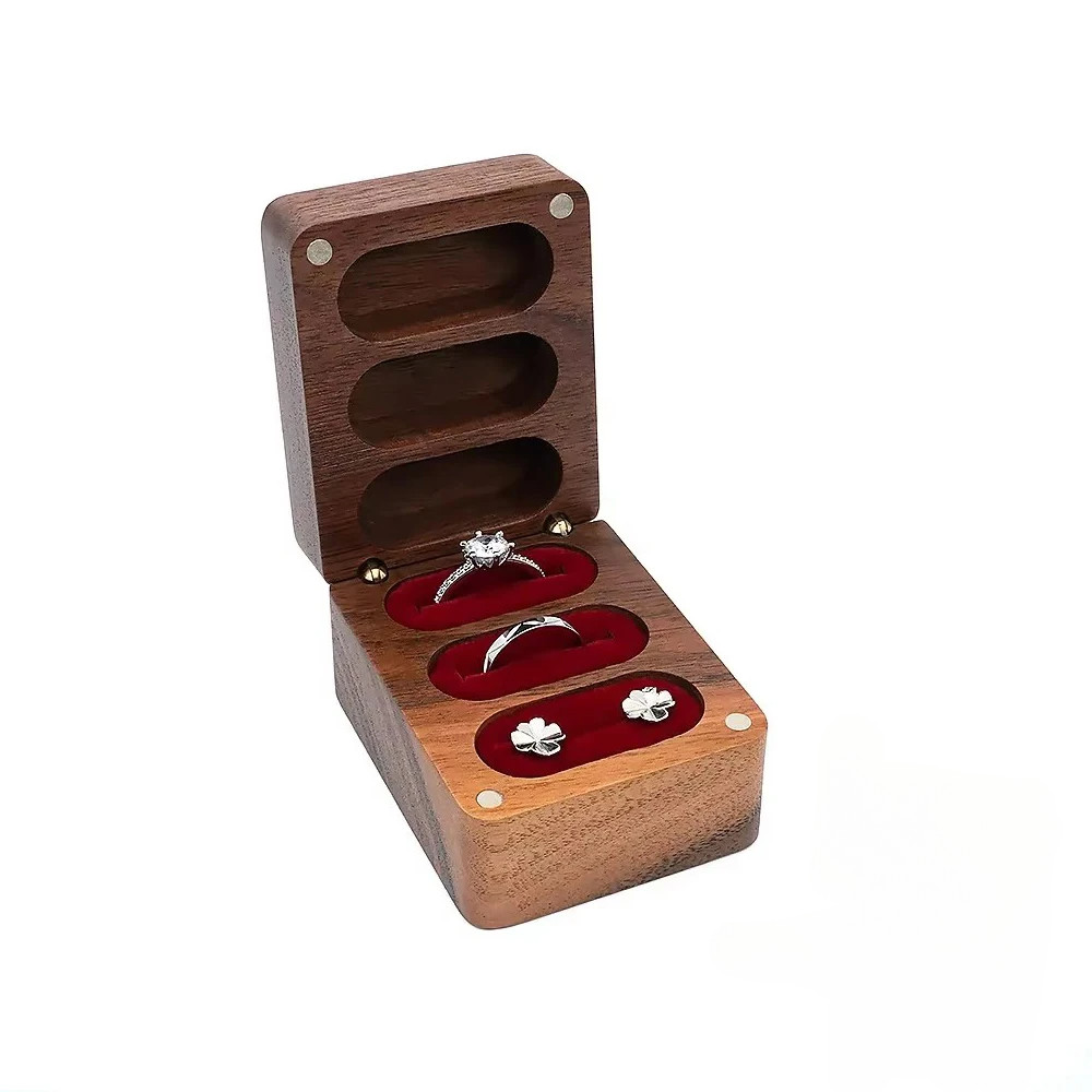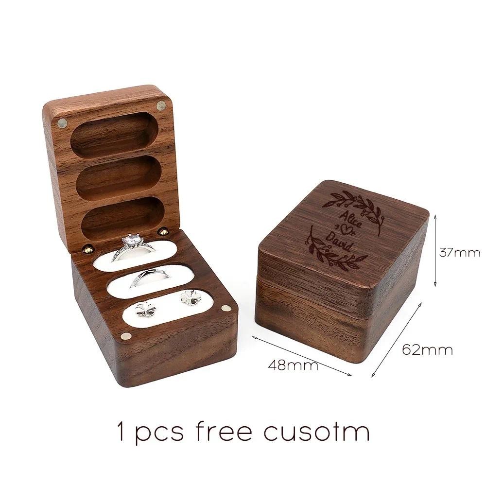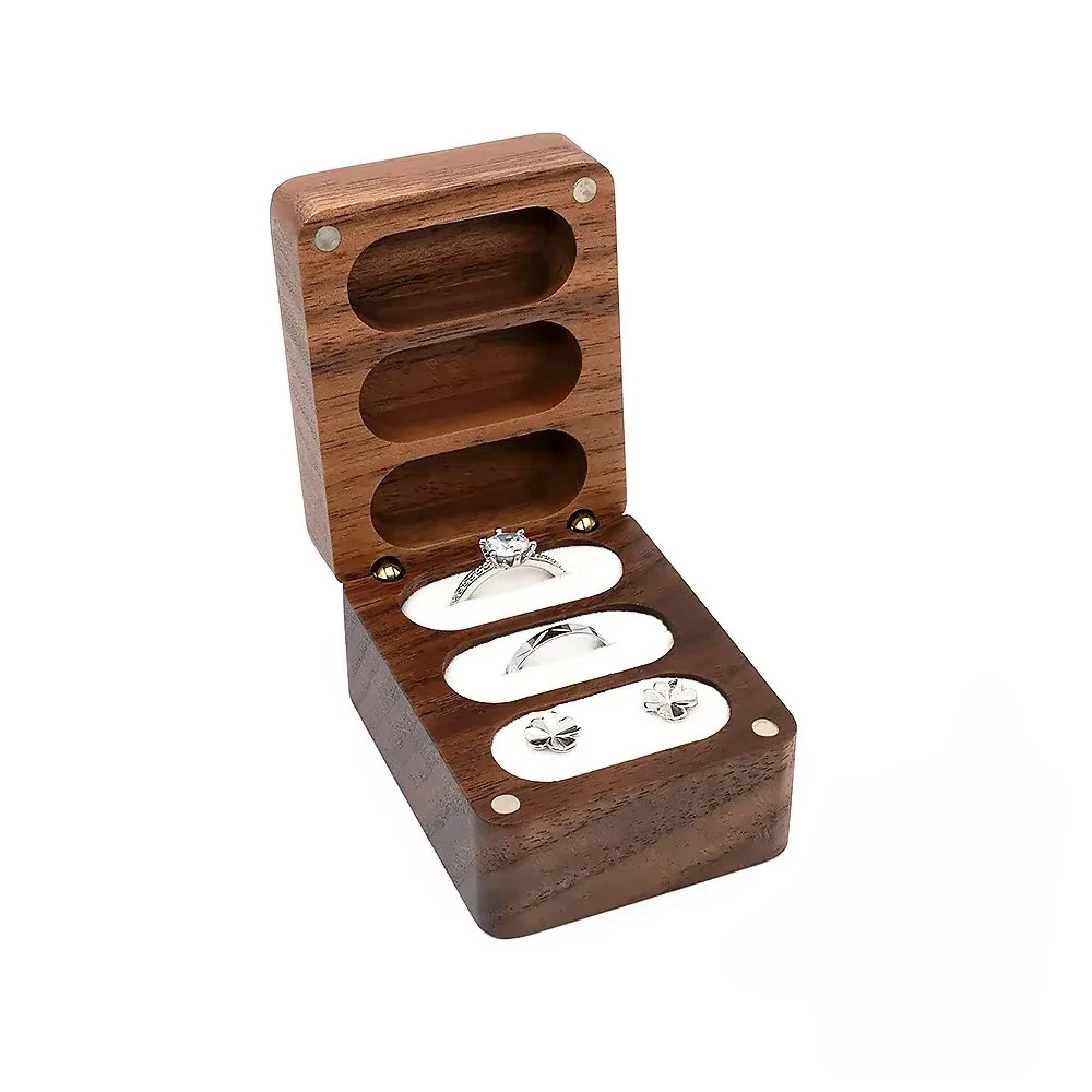 Triple Flip Walnut Wood Ring Box Free Custom Engagement and Wedding Ring Boxes Rings Holder 3 Slots Rings Box Jewelry Bearer