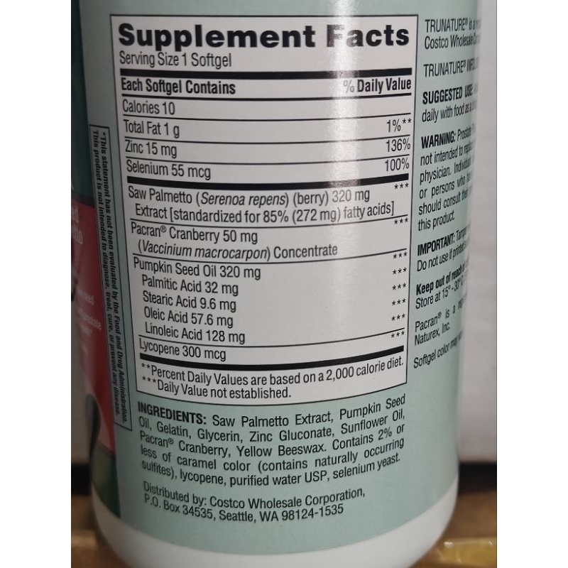 TruNature Prostate plus Health complex 250 softgel with saw palmetto zinc lycopene adult mens multi