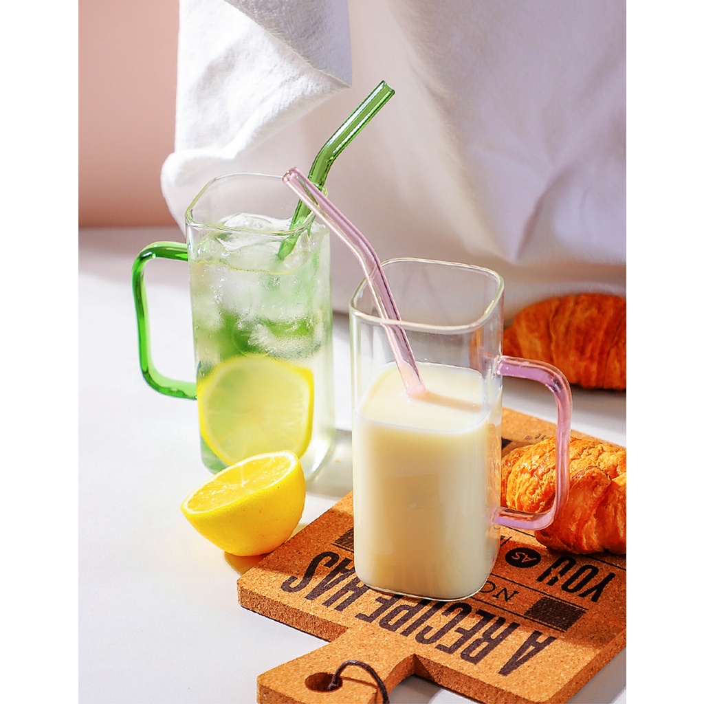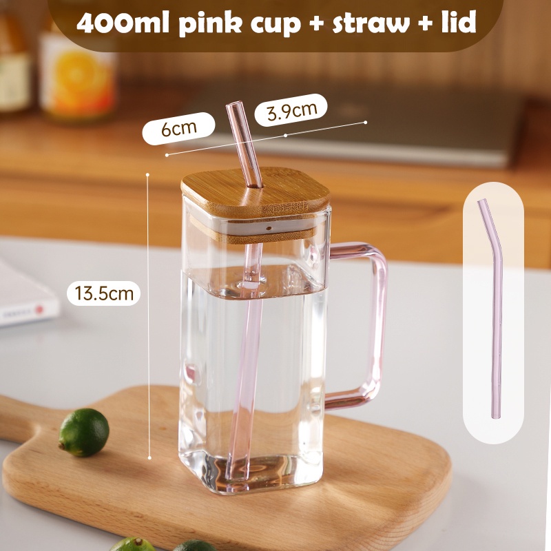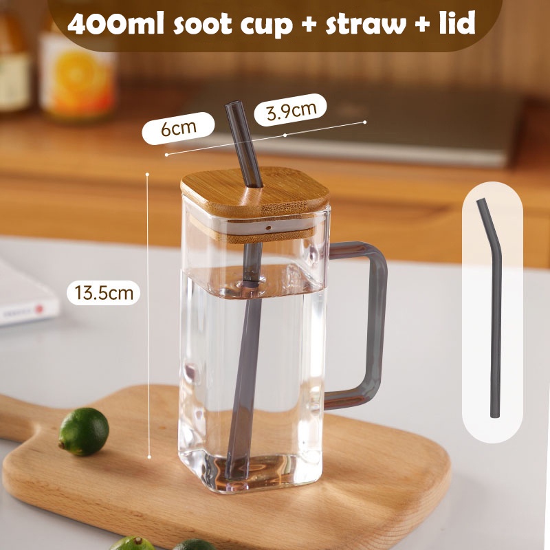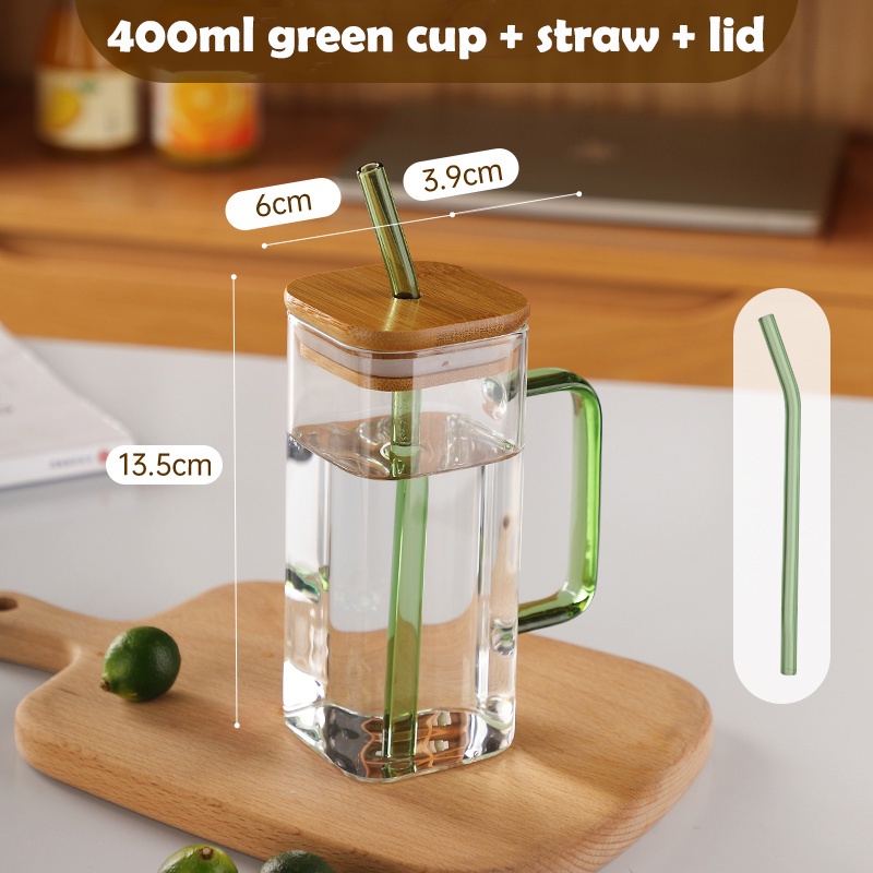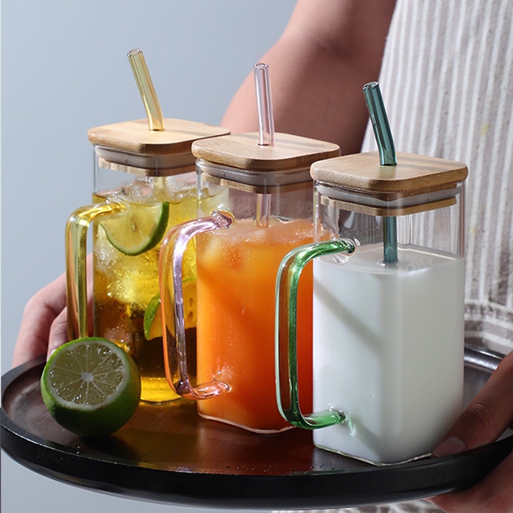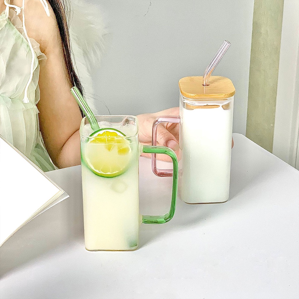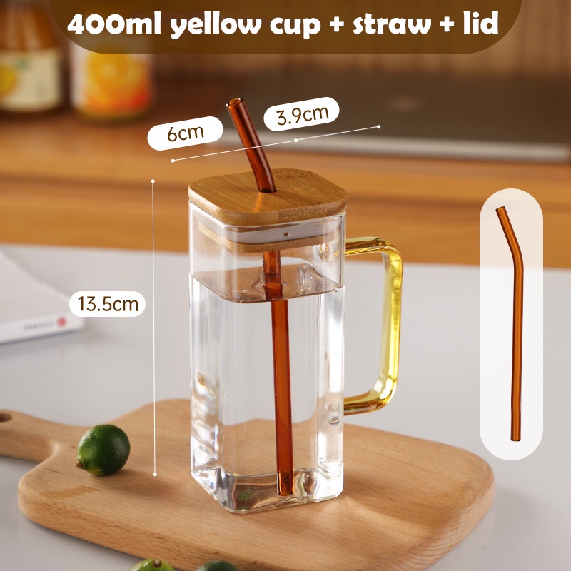 Tumblers na may takip at straw, 13.5 oz na mga baso na may takip na bamboo at straw na gawa sa salamin, may kulay na hawakan para sa soda, iced coffee, gatas, whisky, bubble tea, tubig, at juice.