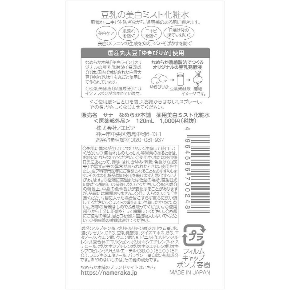 [Whitening / Made in JAPAN] SANA Nameraka Honpo Whitening Mist Lotion Soy milk isoflavone Direct from JAPAN