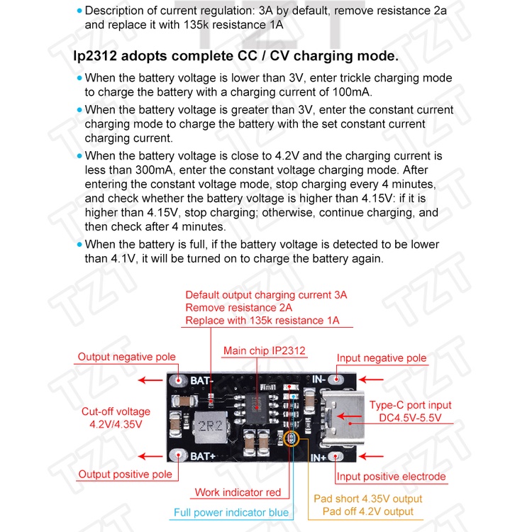 Type C USB Input High Current 3A Polymer Ternary Lithium Battery Quick Fast Charging Board IP2312 CC/CV Mode 5V To 4.2V