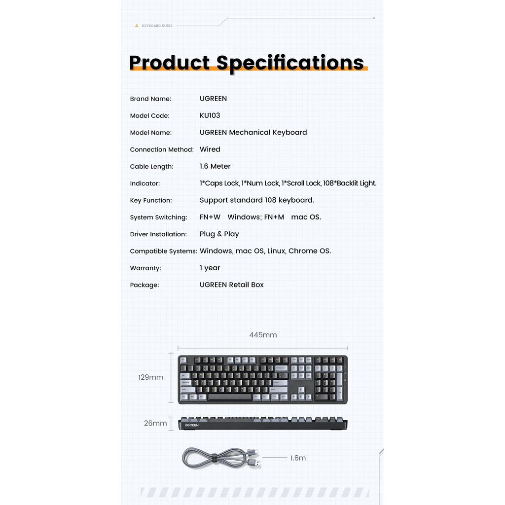 UGREEN Mechanical Keyboard 108 PBT Keycaps Wired Keyboard Red Switch Desktop Laptop Windows Mac OS Gaming