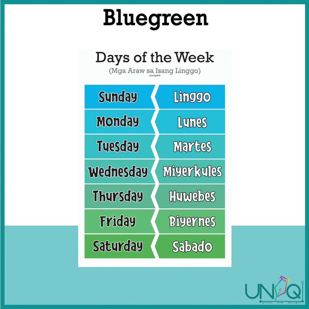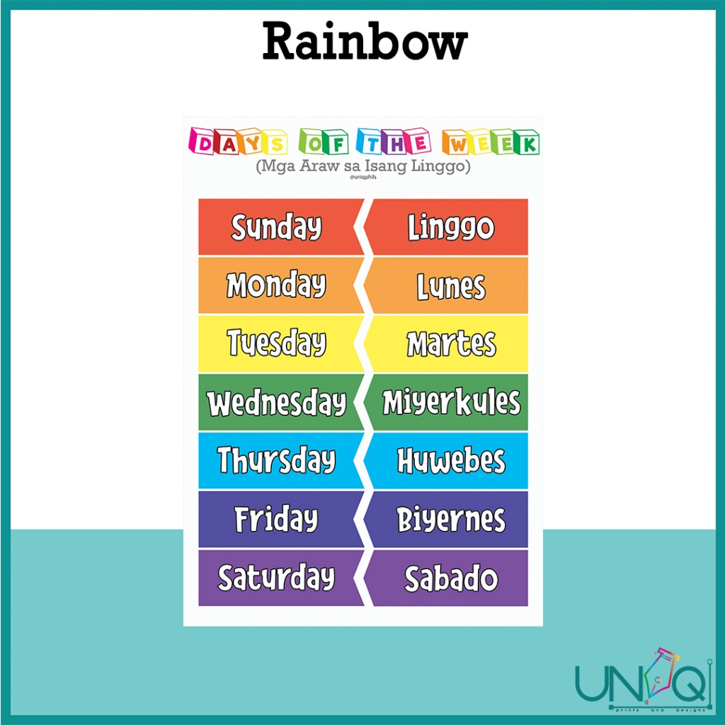 UNIQ Laminated Educational Wall Chart Days of the Week (English & Tagalog) Colorful and Minimalist