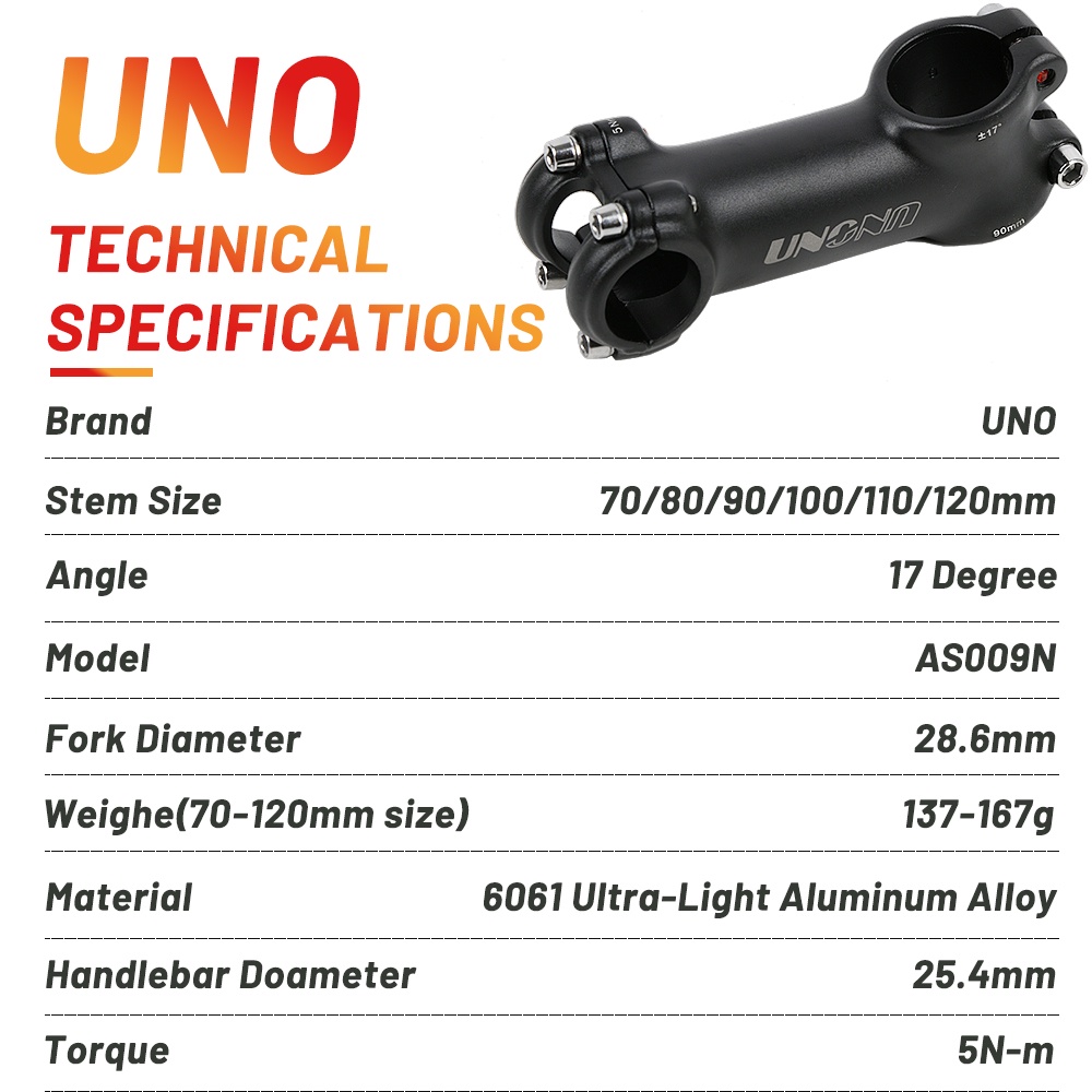 UNO Bike Stem Ultralight 7/17 Degree 28.6 25.4MM 70-120MM MTB Road Stem Bike for Fork Mountain MTB Bicycle Kalloy