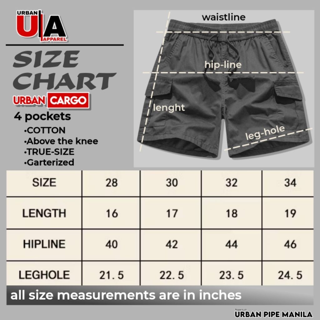 URBAN PIPE Cargo shorts for men 4 pockets Cotton Garterized size by waistline INCHES