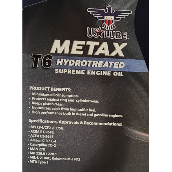 US LUBE METAX T6 SAE Hydrotreated 15W-40 API CF4/SG HT (1Liter)