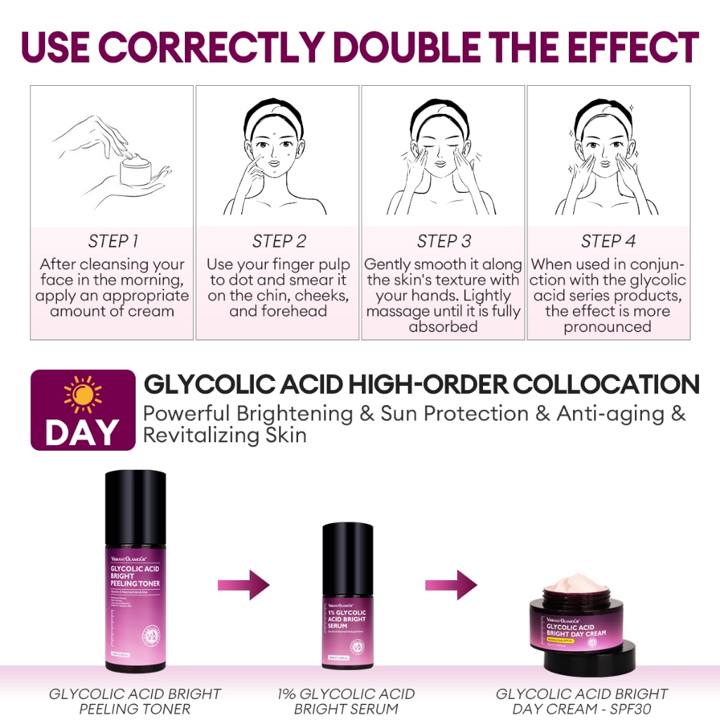 VIBRANT GLAMOUR Glycolic Acid Day Cream SPF20 Fades Dark Spots UV Sunscreen Brightens Skin Tone Anti-Aging Enriched With Pro-Xylane Retinol And for Smooth Refined Skin 30g