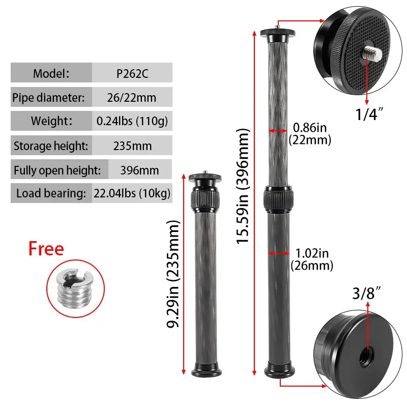 Bexin Universal 1/4 and 3/8 Interface Carbon Fiber Central Axis Extension Selfie Stick Camera Tripod Extension Pole Telescopic Pole