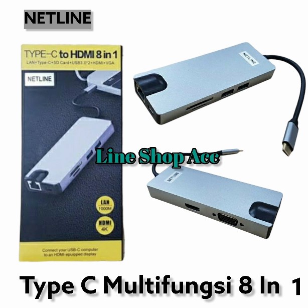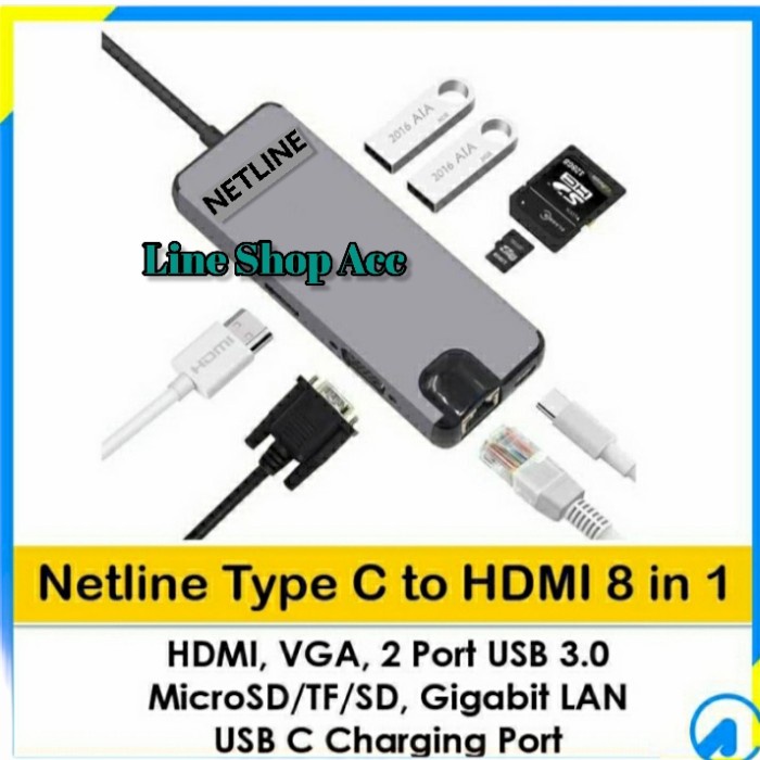 Usb 3.1 Type C 8 In 1 Hdmi Vga, Gigabit Ethernet Lan Usb 3.0 Netline Adapter