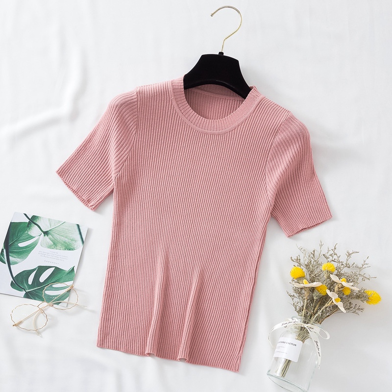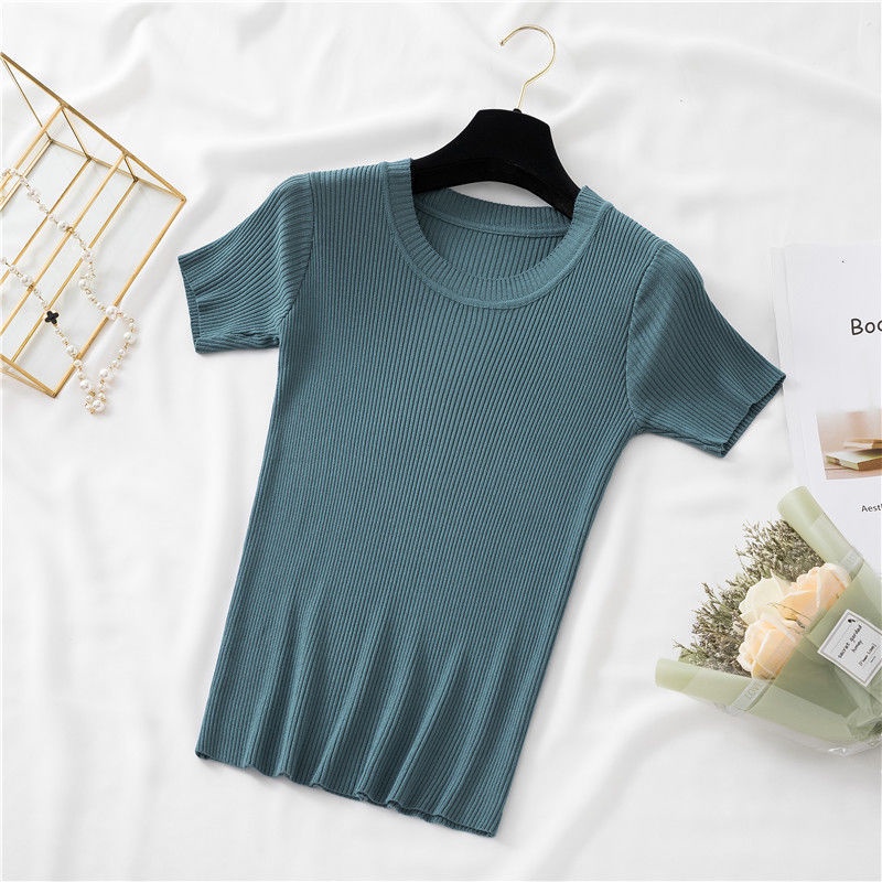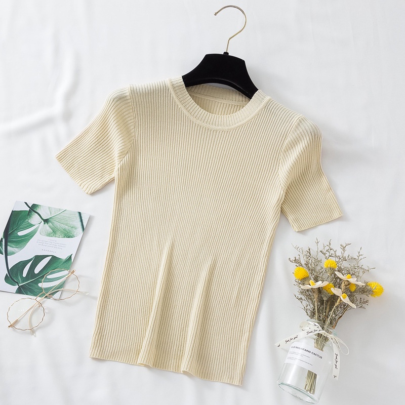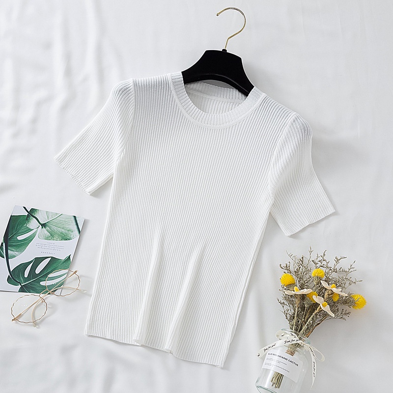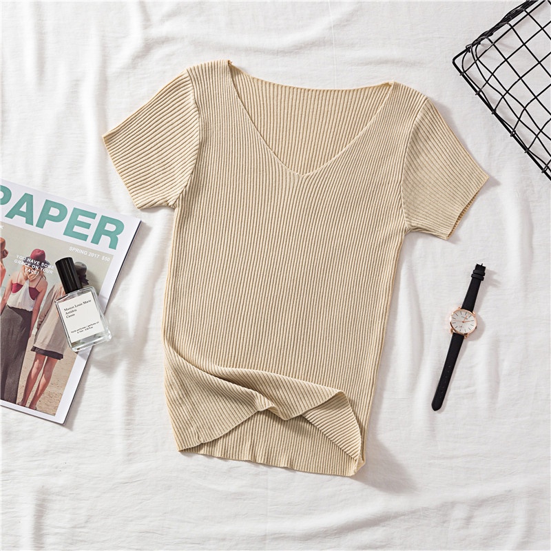 V-Neck Top Women's Vertical Pattern Simple Loose Knitted Ice Silk Short Sleeve T-Shirt Undercoat