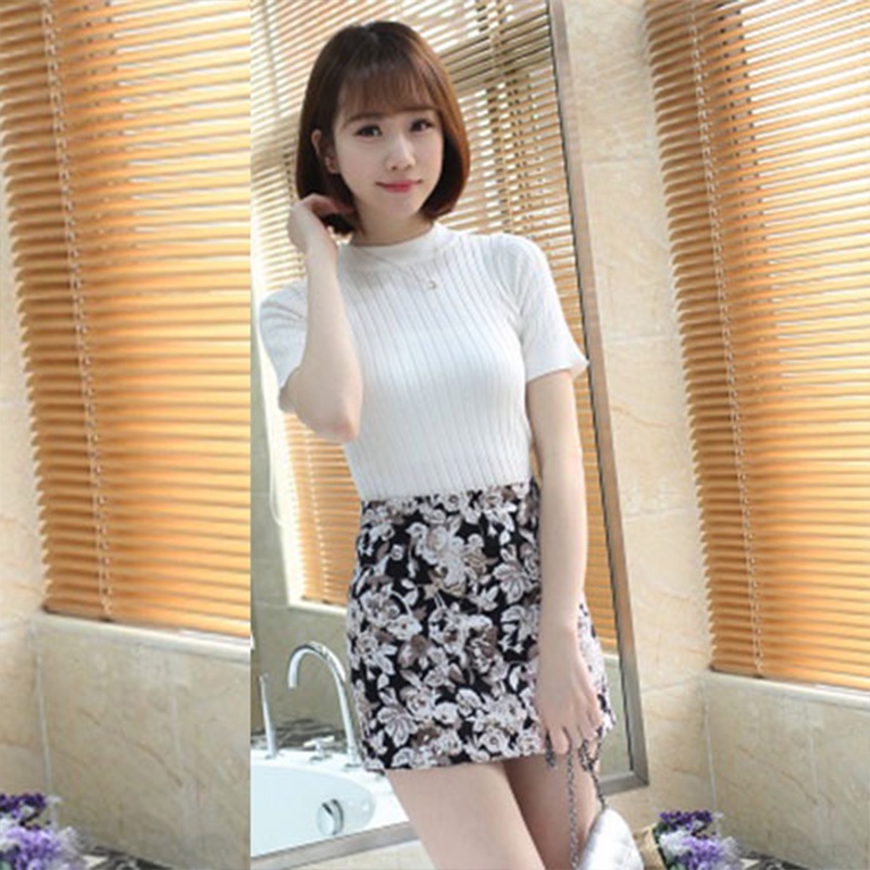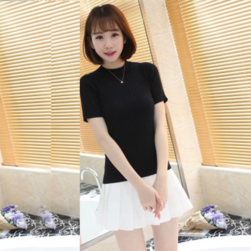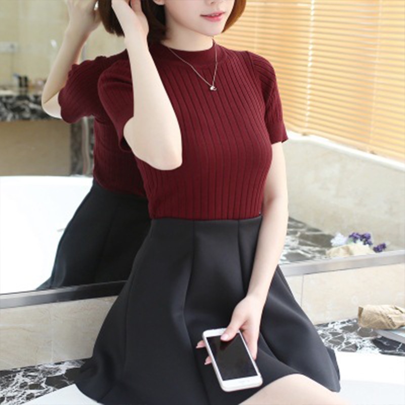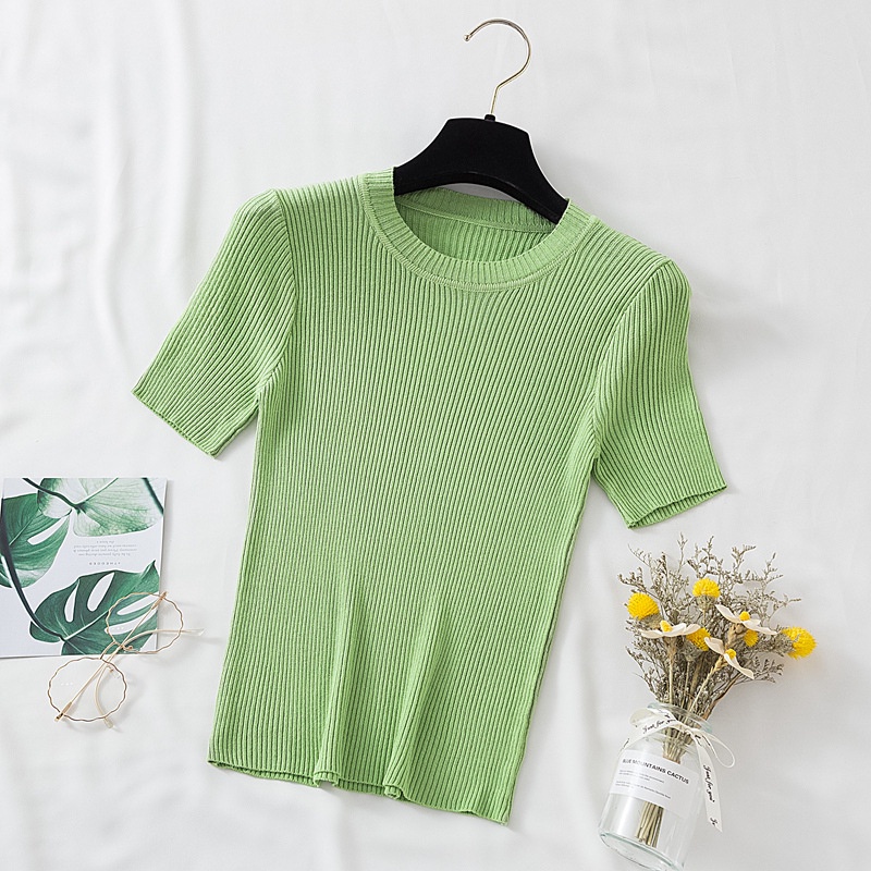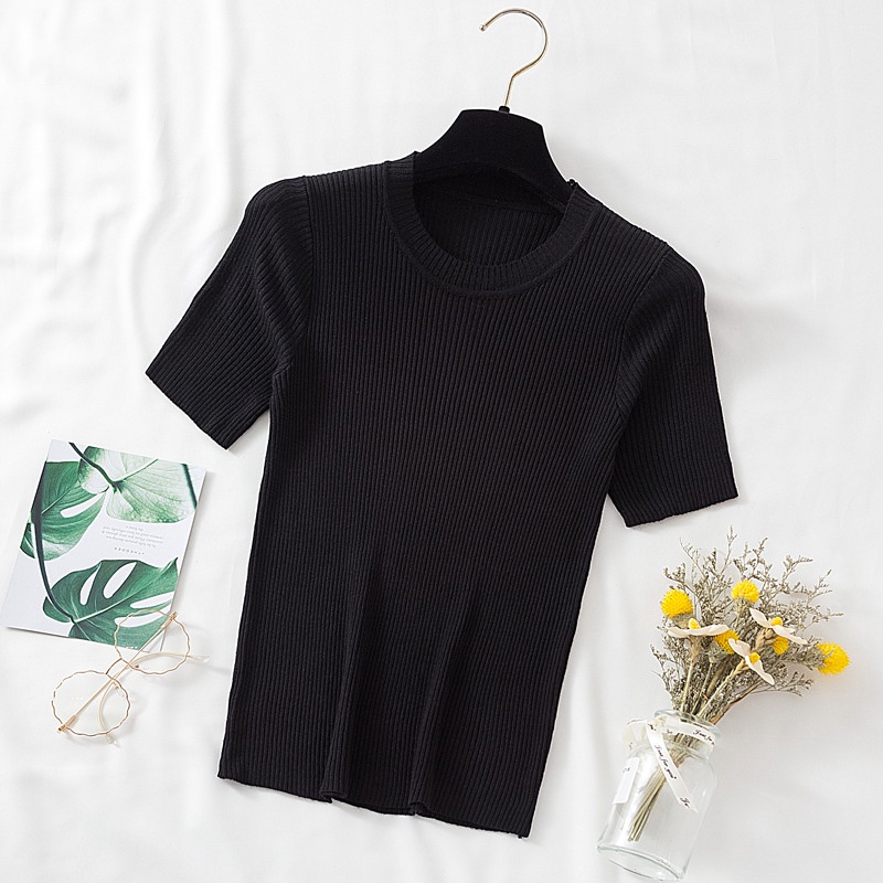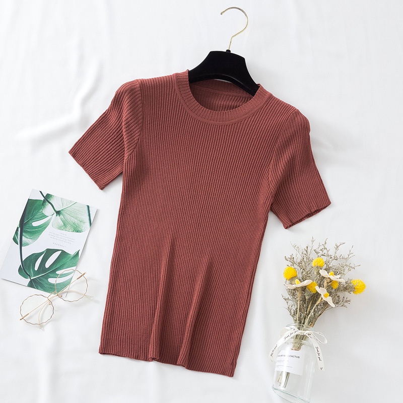 V-Neck Top Women's Vertical Pattern Simple Loose Knitted Ice Silk Short Sleeve T-Shirt Undercoat