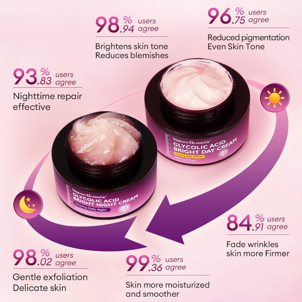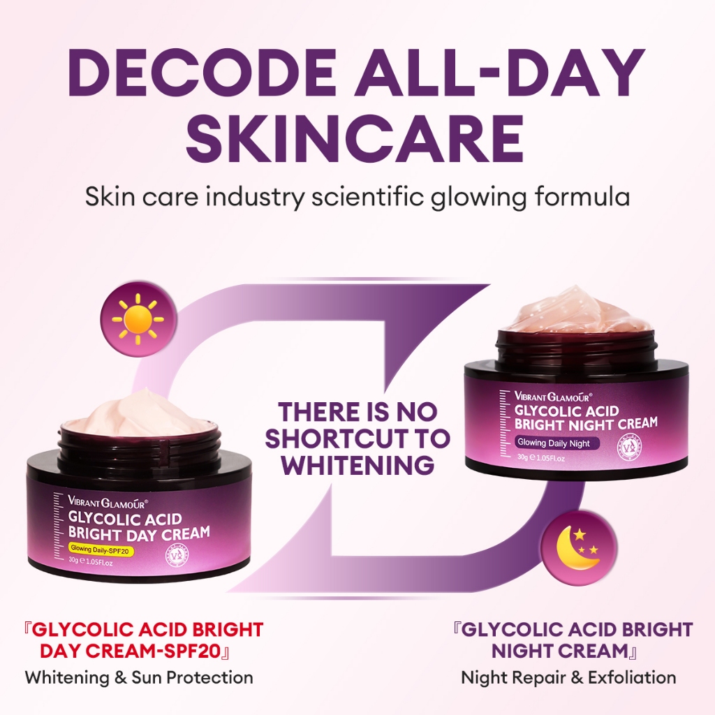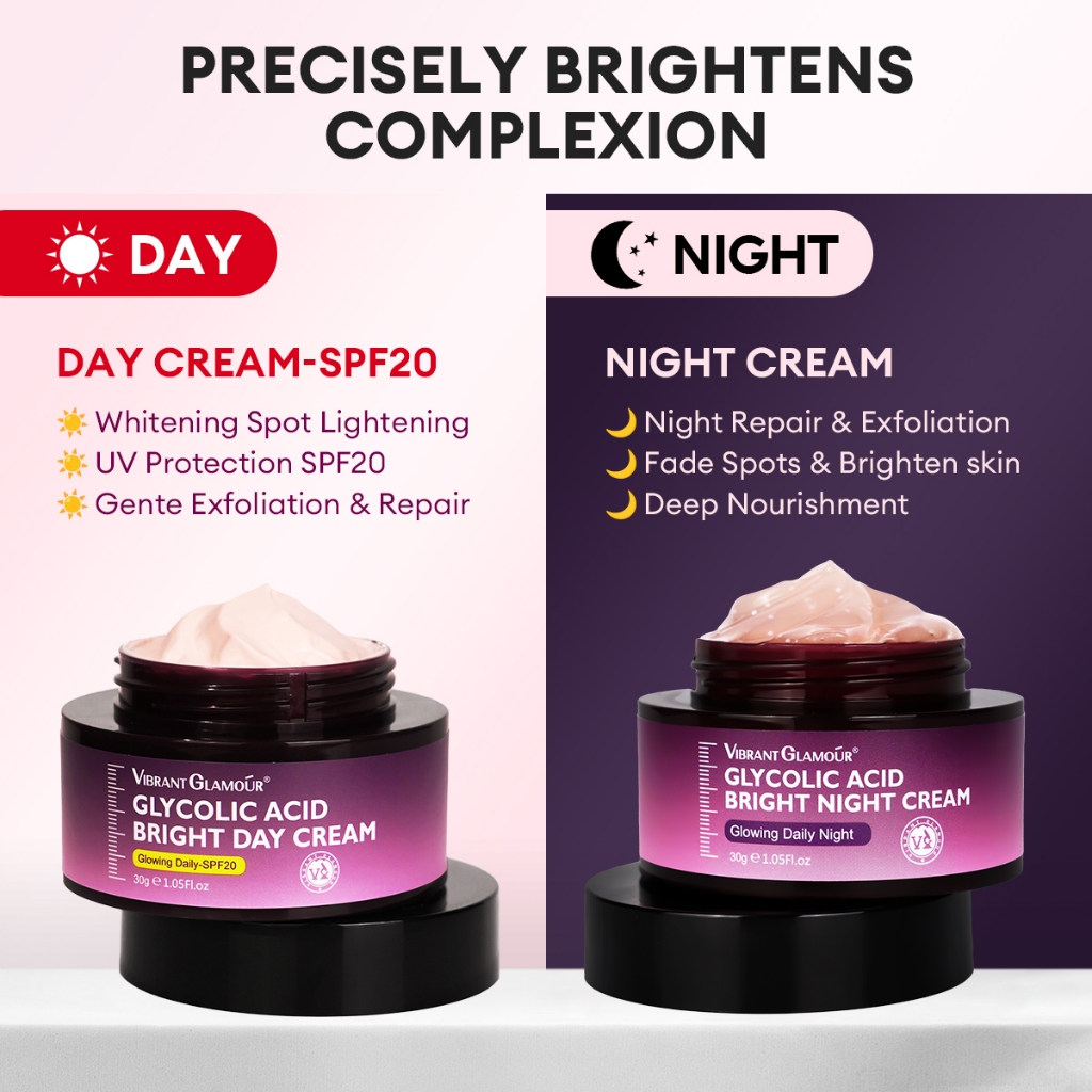 VIBRANT GLAMOUR Glycolic Acid Day Cream SPF20 + Renewal Exfoliating Night Cream Fades Dark Spots UV Sunscreen Brightens Skin Tone Anti-Aging Fine Lines Repair Skin Care