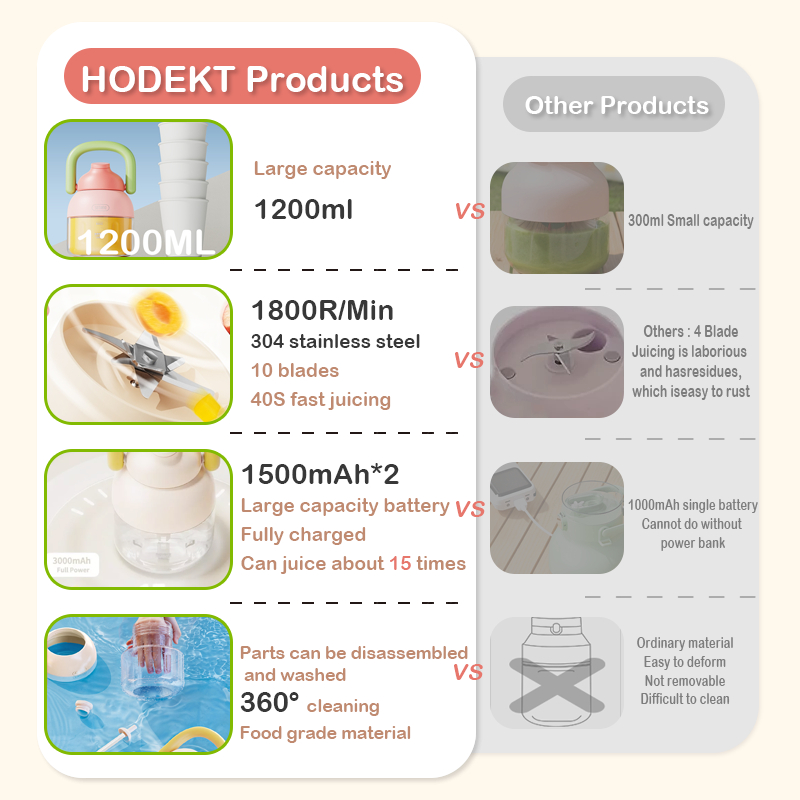 HODEKT Juicing Cup 1.2L Portable Outdoor Wireless Electric Juicer Blender Food processor