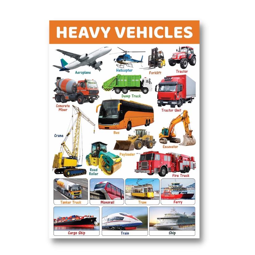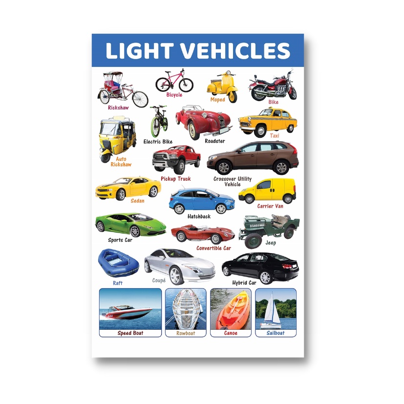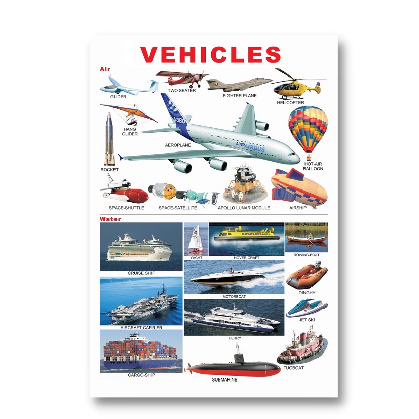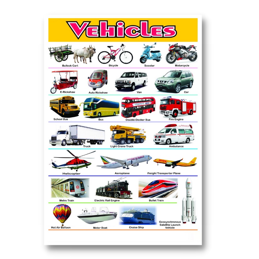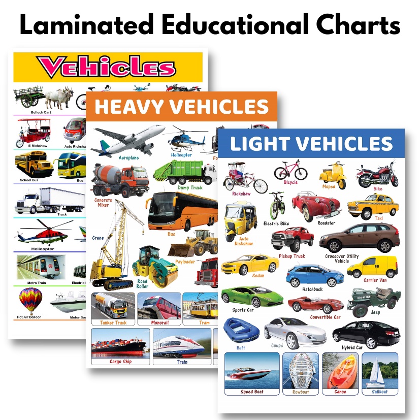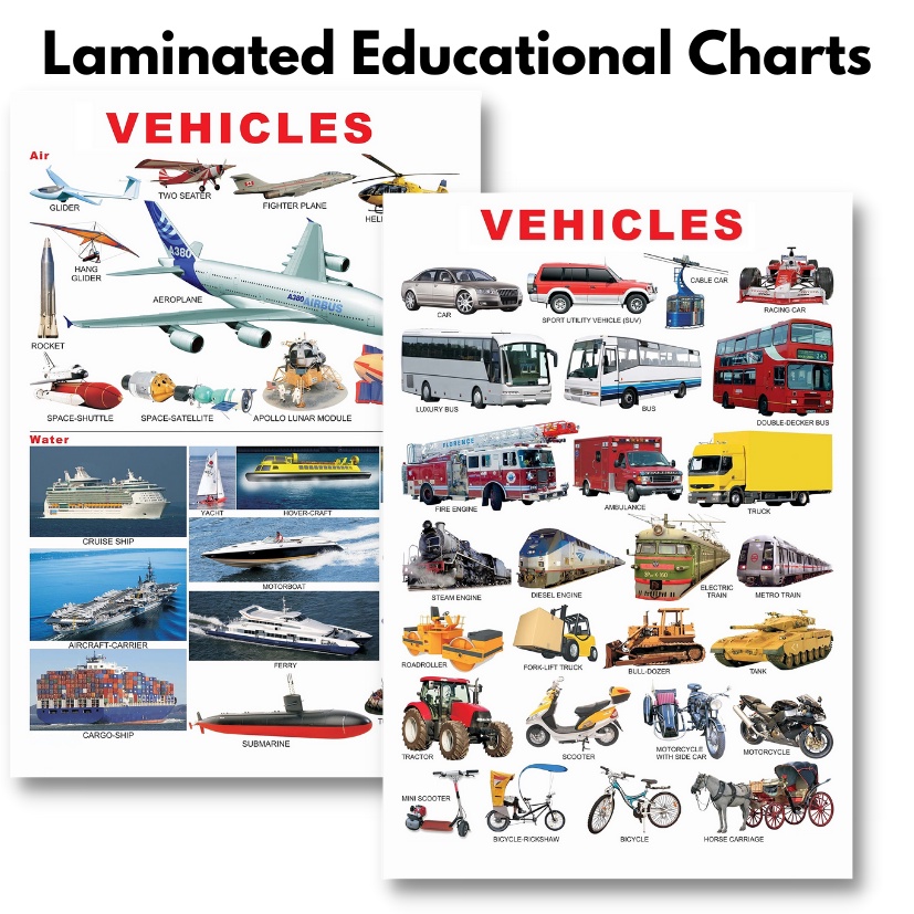 Vehicles Laminated Educational Charts for Kids, Learners and Students
