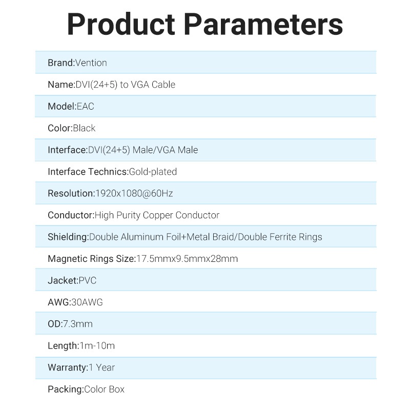 Vention DVI to VGA Cable DVI-I 24+5 Male to VGA Male 15 Pin Adapter Video Cable 1080P for Laptop PC Monitor