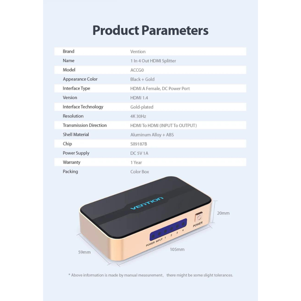 Vention HDMI Splitter 1 In 4 Out HD 4K/30Hz HDMI 1.4 1x2 1x4 Adapter With Power Supply (ACCG0)