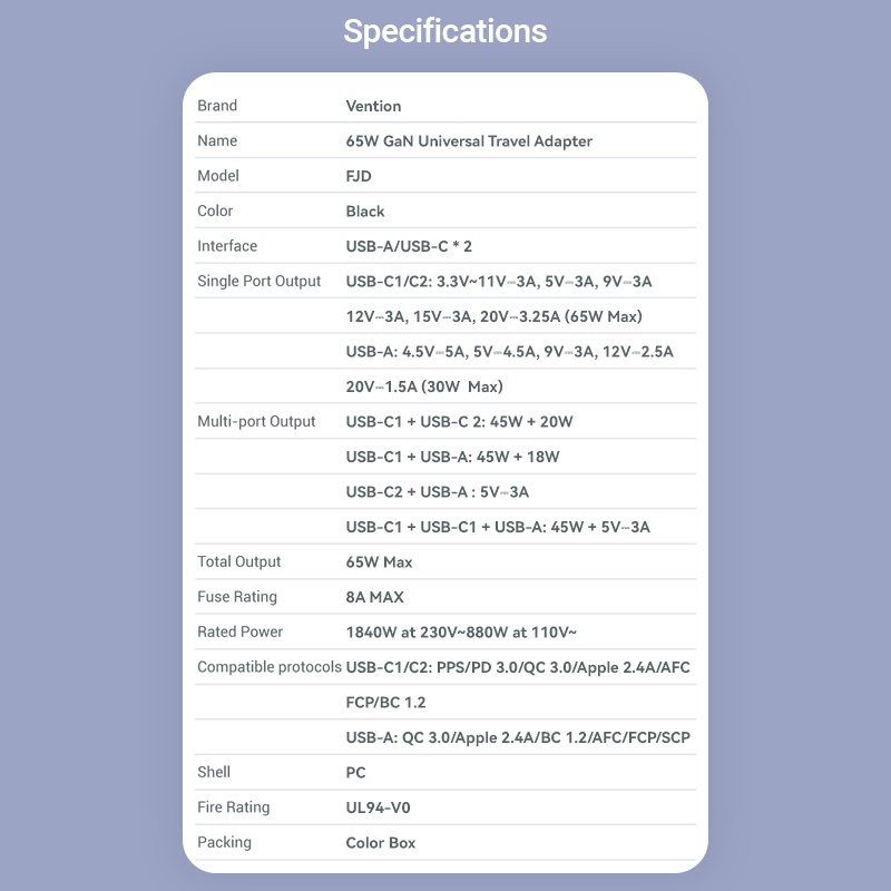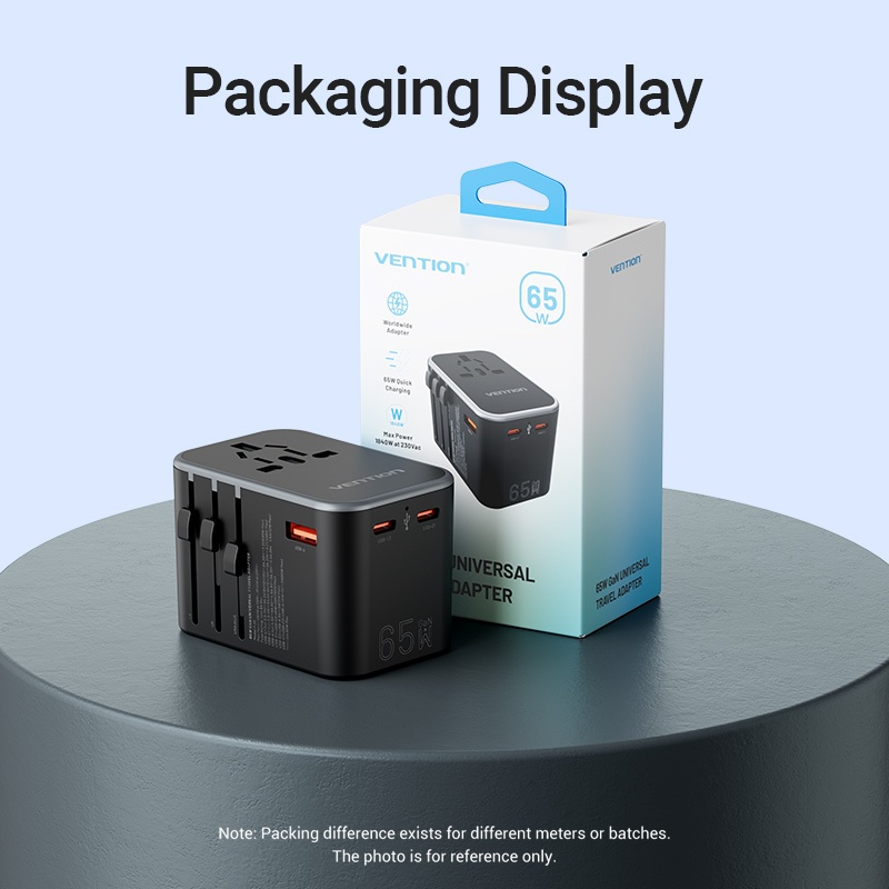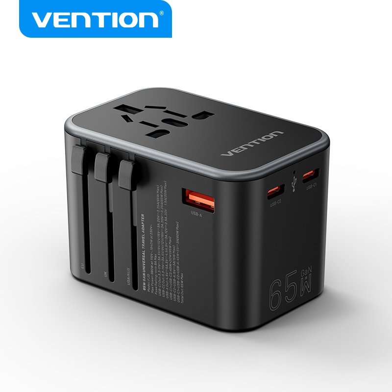 Vention Universal Travel Adapter PD 65W All in One Worldwide Travel Adapter Wall Charger AC Power Plug Adapter for USA EU AUS UK
