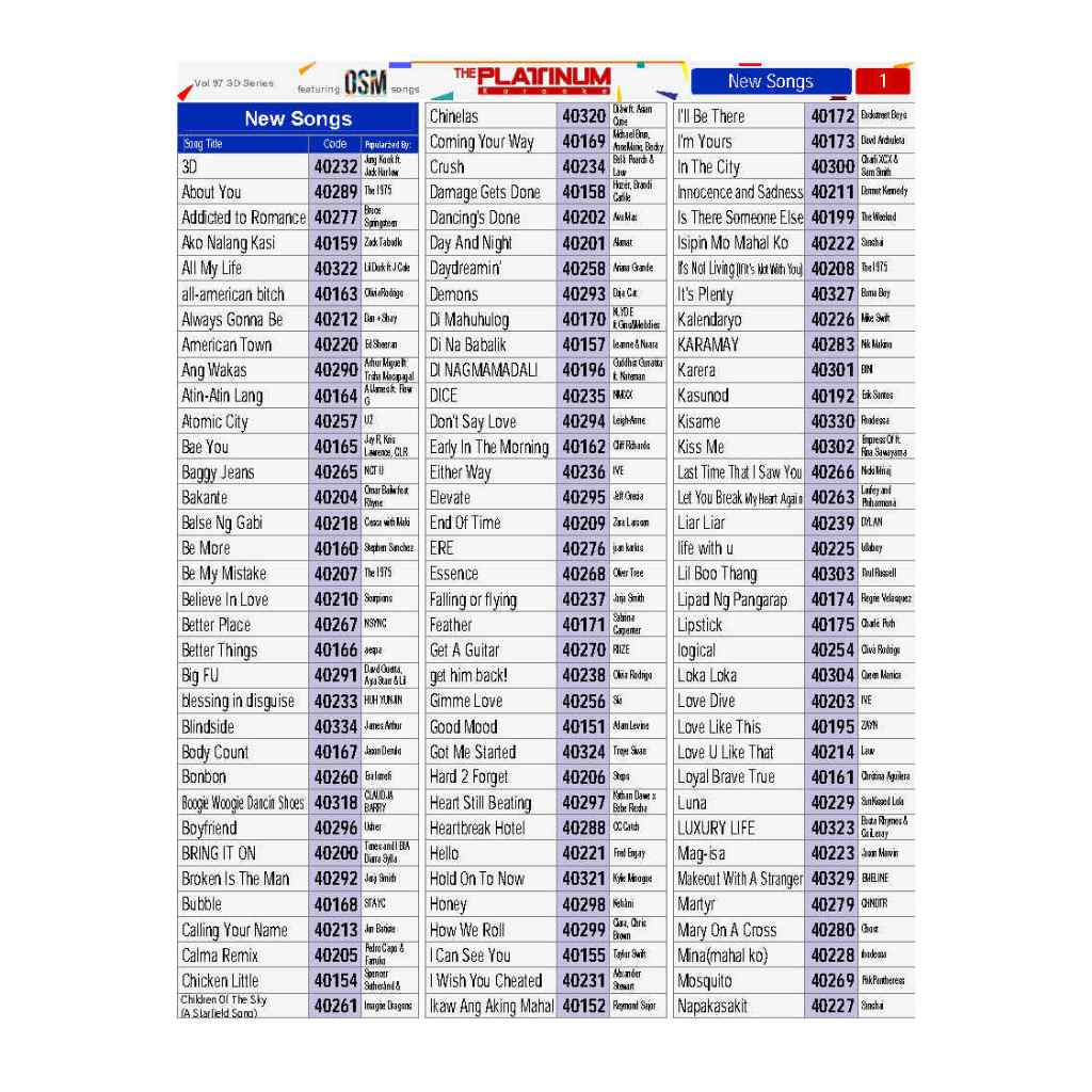 Volume 91 to 99 Song Lists of Platinum Piano, Piano XL SD, Flute, PK-10 (30 PAGES)