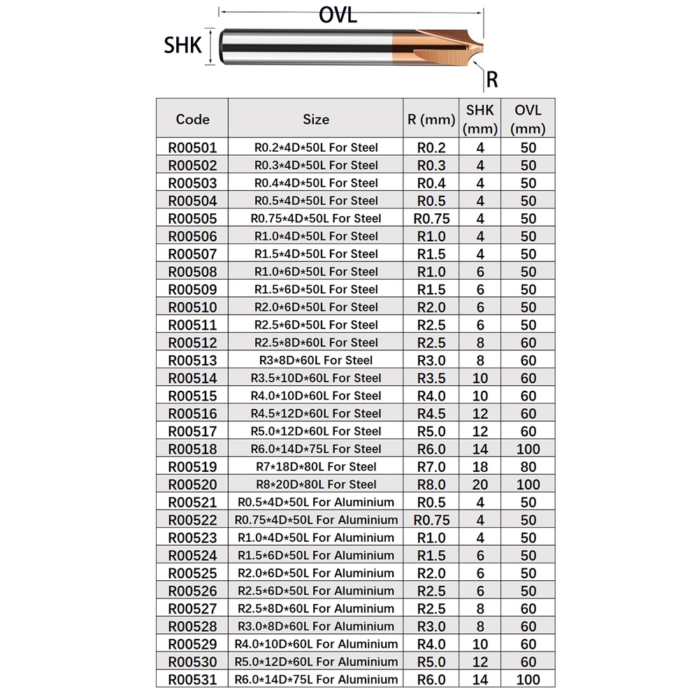 Vsharp R3.5 R4.5 R5 R6 R7 R8 Tungsten Carbide Radius Corner Rounding Cutter End Mill CNC Tool Chamfering Milling Cutter