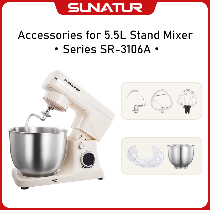 SUNATUR Accessories for 5.5L Stand Mixer - Egg Beater,Dough Hook,Mixing Paddle,Lid,Bowl (SR-3106A)